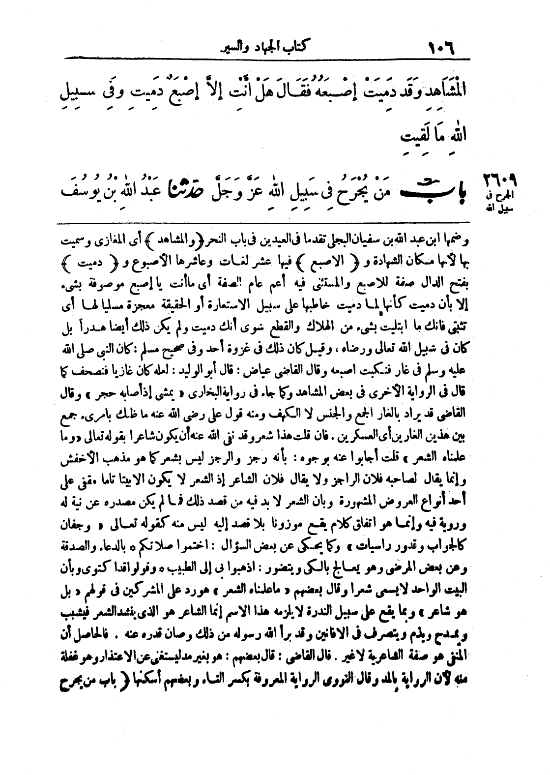 وضمها ابن عبد الله بن سفيان البجلي تقدماً في العيدين في باب النحر (والمشاهد) أي المغازي وسميت بها لأنها مكان الشهادة و (الأصبع) فيها عشر لغات وعاشرها الأصبوع و (دميت) بفتح الدال صفة للأصبع والمستثنى فيه أعم عام الصفة أي ما أنت يا إصبع موصوفة بشيء إلا بأن دميت كأنها لما دميت خاطبها على سبيل الاستعارة أو الحقيقة معجزة مسلياً لها أي تثبتي فإنك ما ابتليت بشيء من الهلاك والقطع سوى أنك دميت ولم يكن ذلك أيضاً هدراً بل كان في سبيل الله تعالى ورضاه، وقيل كان ذلك في غزة أحد وفي صحيح مسلم: كان النبي صلى الله عليه وسلم في غار فنكبت أصبعه وقال القاضي عياض: قال أبو الوليد: لعله كان غازياً فتصحف كما قال في الرواية الأخرى في بعض المشاهد وكما جاء في رواية البخاري ((يمشي إذ أصابه حجر)) وقال القاضي قد يراد بالغاز الجمع والجنس لا الكهف ومنه قول علي رضي الله عنه ما ظنك بامرئ جمع بين هذين الغارين أي العسكرين. فإن قلت هذا شعر وقد نفى الله عنه أن يكون شاعراً بقوله تعالى ((وما علمناه الشعر)) قلت أجابوا عنه بوجوه: بأنه رجز والرجز ليس بشعر كما هو مذهب الأخفش وإنما يقال لصاحبه فلان الراجز ولا يقال فلان الشاعر إذ الشعر لا يكون إلا بيتاً تاماً مقفى على أحد أنواع العروض المشهورة وبأن الشعر لابد فيه من قصد ذلك فما لم يكن مصدره عن نية له وروية فيه وإنما هو اتفاق كلام يقع موزونا بلا قصد إليه ليس منه كقوله تعالى ((وجفان كالجواب وقدور راسيات)) وكما يحكي عن بعض السؤال: اختموا صلاتكم. بالدعاء والصدقة وعن بعض المرضى وهو يعالج بالكي ويتضور: اذهبوا بي إلى الطبيب. وقولوا قد اكتوى وبأن البيت الواحد لا يسمى شعراً وقال بعضهم ((ما علمناه الشعر)) هو رد على المشركين في قولهم ((بل هو شاعر)) ومما يقع على سبيل الندرة لا يلزمه هذا الاسم إنما الشاعر هو الذي ينشد الشعر فيشبب ويمدح ويذم ويتصرف في الافانين وقد برأ الله رسوله من ذلك وصان قدره عنه. فالحاصل أن المنفى هو صفة الشاعرية لا غير. قال القاضي: قال بعضهم: هو بغير مد ليستغنى عن الاعتذار وهو غفلة منه لأن الرواية بالمد وقال النووي الرواية المعروفة بكسر التاء وبعضهم أسكنها (باب من يجرح