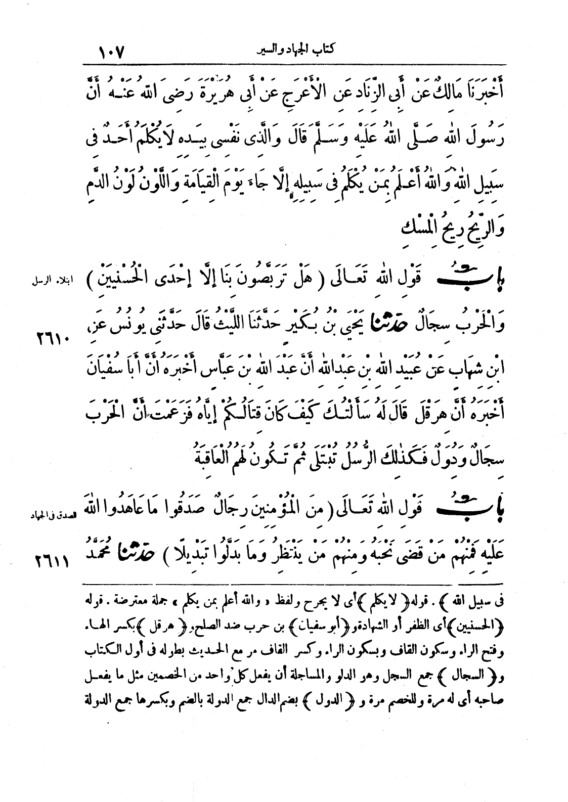 في سبيل الله). قوله (لا يكلم) أي لا يجرح ولفظ ((والله أعلم بمن يكلم)) جملة معترضة. قوله (الحسنيين) أي الظفر أو الشهادة و (ابو سفيان) بن حرب ضد الصلح و (هرقل) بكسر الهاء وفتح الراء وسكون القاف وبسكون الراء وكسر القاف مر مع الحديث بطولة في أول الكتاب و (السجال) جمع السجل وهو الدلو والمساجلة أن يفعل كل واحد من الخصمين مثل ما يفعل صاحبه أي له مرة وللخصم مرة و (الدول) بضم الدال جمع الدولة بالضم وبكسرها جمع الدولة