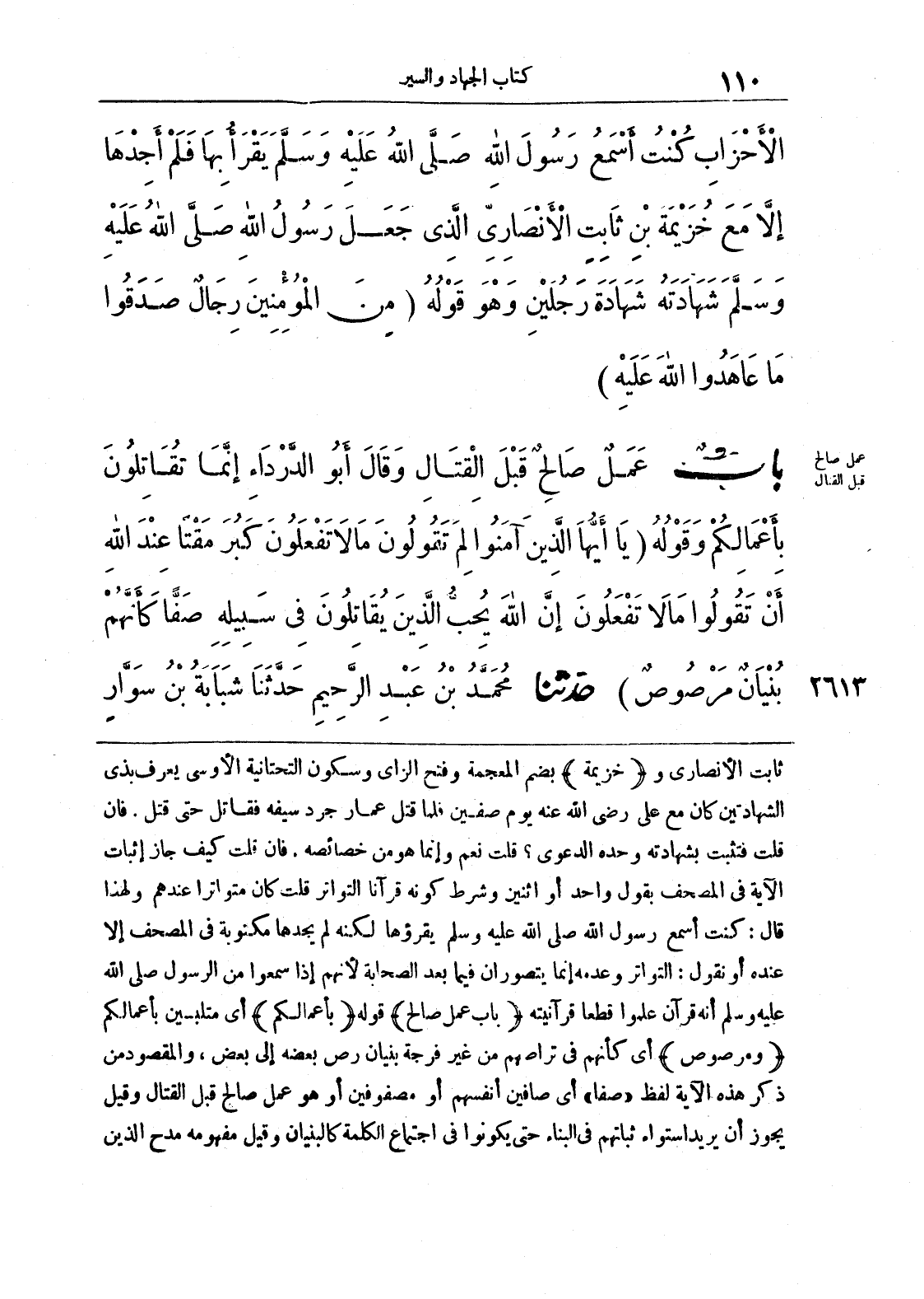 ثابت الأنصاري و (خزيمة) بضم المعجمة وفتح الزاي وسكون التحتانية الأوسي يعرف بذي الشهادتين كان مع علي رضي الله عنه يوم صفين فلما قتل عمار جرد سيفه فقاتل حتى قتل. فإن قلت فتثبت بشهادته وحده الدعوى؟ قلت نعم وإنما هو من خصائصه. فإن قلت كيف جاز إثبات الآية في المصحف بقول واحد أو اثنين وشرط كونه قرآناً التواتر قلت كان متواتراً عندهم ولهذا قال: كنت أسمع رسول الله صلى الله عليه وسلم يقرؤها لكنه لم يجدها مكتوبة في المصحف إلا عنده أو نقول: التواتر وعدمه إنما يتصوران فيما بعد الصحاح لأنهم إذا سمعوا من الرسول صلى الله عليه وسلم أنه قرآن قطعاً قرآنيته (باب عمل صالح) قوله (بأعمالكم) أي متلبسين بأعمالكم (ومرصوص) أي كأنهم في تراصهم من غير فرجة بنيان رص بعضه إلى بعض، والمقصود من ذكر هذه الآية لفظ ((صفاً)) أي صافين أنفسهم أو مصفوفين أو هو عمل صالح قبل القتال وقيل يجوز أن يريد استواء ثباتهم في البناء حتى يكونوا في اجتماع الكلمة كالبنيان وقيل مفهومه مدح الذين