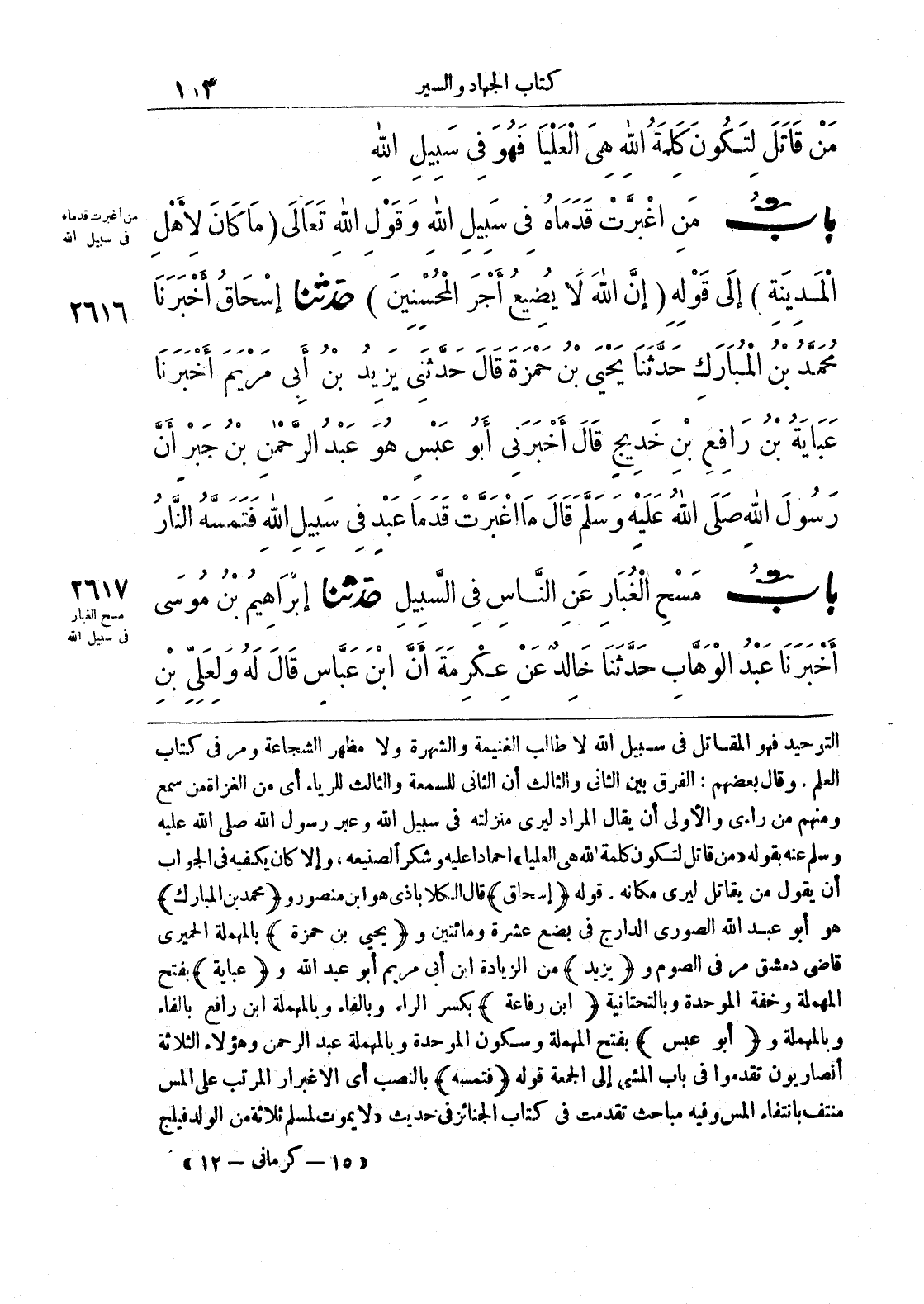 التوحيد فهو المقاتل في سبيل الله لا طالب الغنيمة والشهرة ولا مظهر الشجاعة ومر في كتاب العلم. وقال بعضهم: الفرق بين ثاني والثالث أن الثاني للسمعة والثالث للرياء أي من الغزاة من سمع ومنهم من راءى والأولى أن يقال المراد ليرى منزلته في سبيل وعبر رسول الله صلى الله عليه وسلم عنه بقوله ((من قاتل لتكون كلمة الله هي العليا)) إحماداً عليه وشكراً لصنيعه، وإلا كان يكفيه في الجواب أن يقول من يقاتل ليرى مكانه. قوله (إسحاق) قال الكلاباذي هو ابن منصور و (محمد بن المبارك) هو أبو عبد الله الصوري الدراج في بضع عشرة ومائتين و (يحيي بن حمزة) بالمهملة الحميري قاضي دمشق مر في الصوم و (يزيد) من الزيادة ابن أبي مريم أبو عبد الله و (عباية) بفتح المهملة وخفة الموحدة وبالتحتانية (ابن رفاعة) بكسر الراء وبالفاء وبالمهملة ابن رافع بالفاء وبالمهملة و (أبو عبس) بفتح المهملة وسكون الموحدة وبالمهملة عبد الرحمن وهؤلاء الثلاثة أنصاريون تقدموا في باب المشي إلى الجمعة قوله (فتمسه) بالنصب أي الاغبرار المرتب على المس منتف المس وفيه مباحث تقدمت في كتاب الجنائز في حديث ((لا يموت لمسلم ثلاثة من الولد فيلج