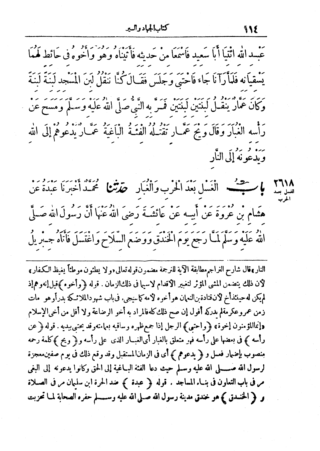 2618 - حَدَّثَنَا مُحَمَّدُ بْنُ سَلَامٍ أَخْبَرَنَا عَبْدَةُ عَنْ هِشَامِ بْنِ عُرْوَةَ عَنْ أَبِيهِ عَنْ عَائِشَةَ رَضِيَ اللَّهُ عَنْهَا أَنَّ رَسُولَ اللَّهِ صَلَّى اللَّهُ عَلَيْهِ وَسَلَّمَ لَمَّا رَجَعَ يَوْمَ الْخَنْدَقِ وَوَضَعَ السِّلَاحَ وَاغْتَسَلَ فَأَتَاهُ جِبْرِيلُ
