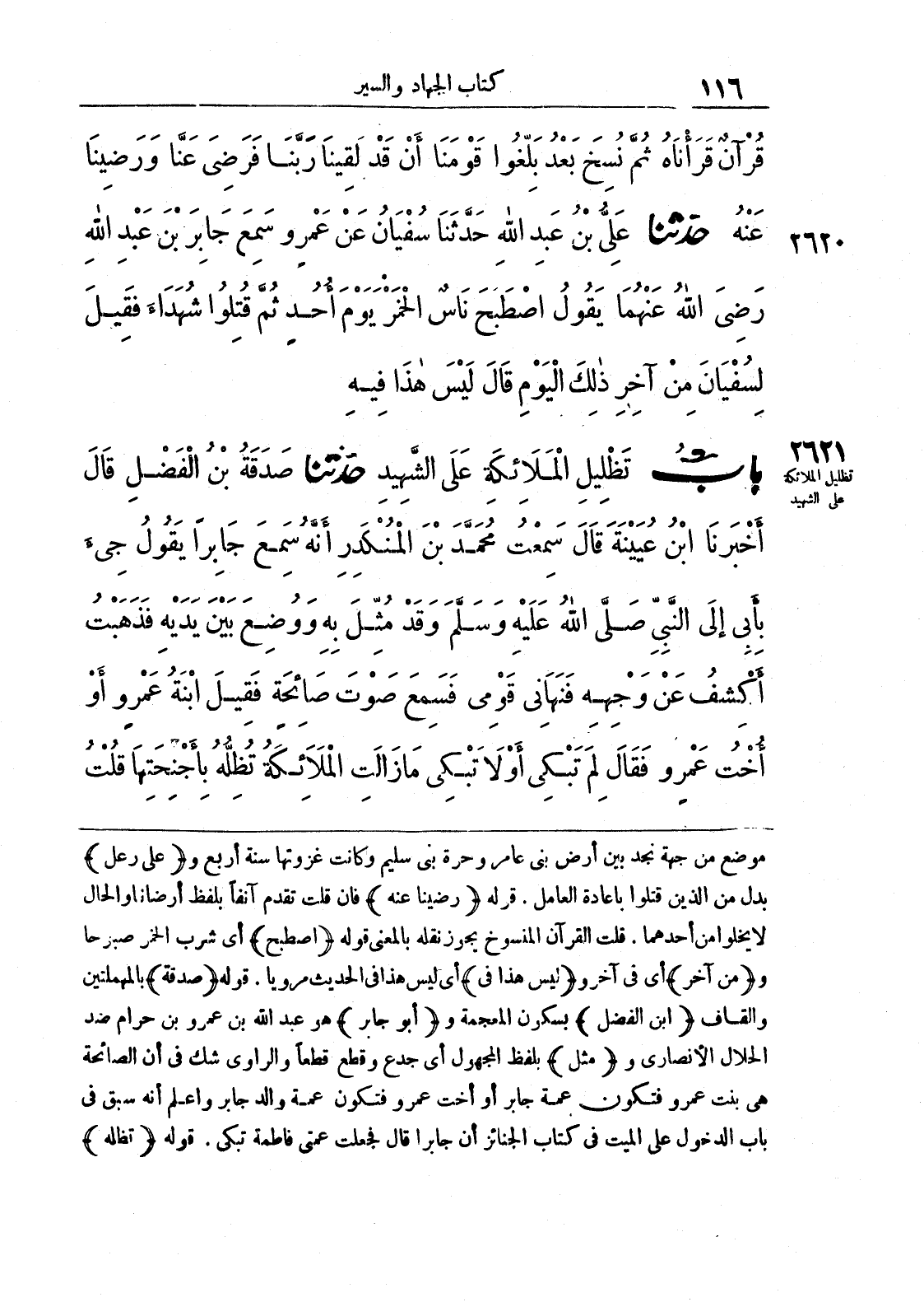 2621 - حَدَّثَنَا صَدَقَةُ بْنُ الْفَضْلِ قَالَ أَخْبَرَنَا ابْنُ عُيَيْنَةَ قَالَ سَمِعْتُ مُحَمَّدَ بْنَ الْمُنْكَدِرِ أَنَّهُ سَمِعَ جَابِرًا يَقُولُ جِيءَ بِأَبِي إِلَى النَّبِيِّ صَلَّى اللَّهُ عَلَيْهِ وَسَلَّمَ وَقَدْ مُثِّلَ بِهِ وَوُضِعَ بَيْنَ يَدَيْهِ فَذَهَبْتُ أَكْشِفُ عَنْ وَجْهِهِ فَنَهَانِي قَوْمِي فَسَمِعَ صَوْتَ صَائِحَةٍ فَقِيلَ ابْنَةُ عَمْرٍو أَوْ أُخْتُ عَمْرٍو فَقَالَ لِمَ تَبْكِي أَوْ لَا تَبْكِي مَا زَالَتْ الْمَلَائِكَةُ تُظِلُّهُ بِأَجْنِحَتِهَا قُلْتُ