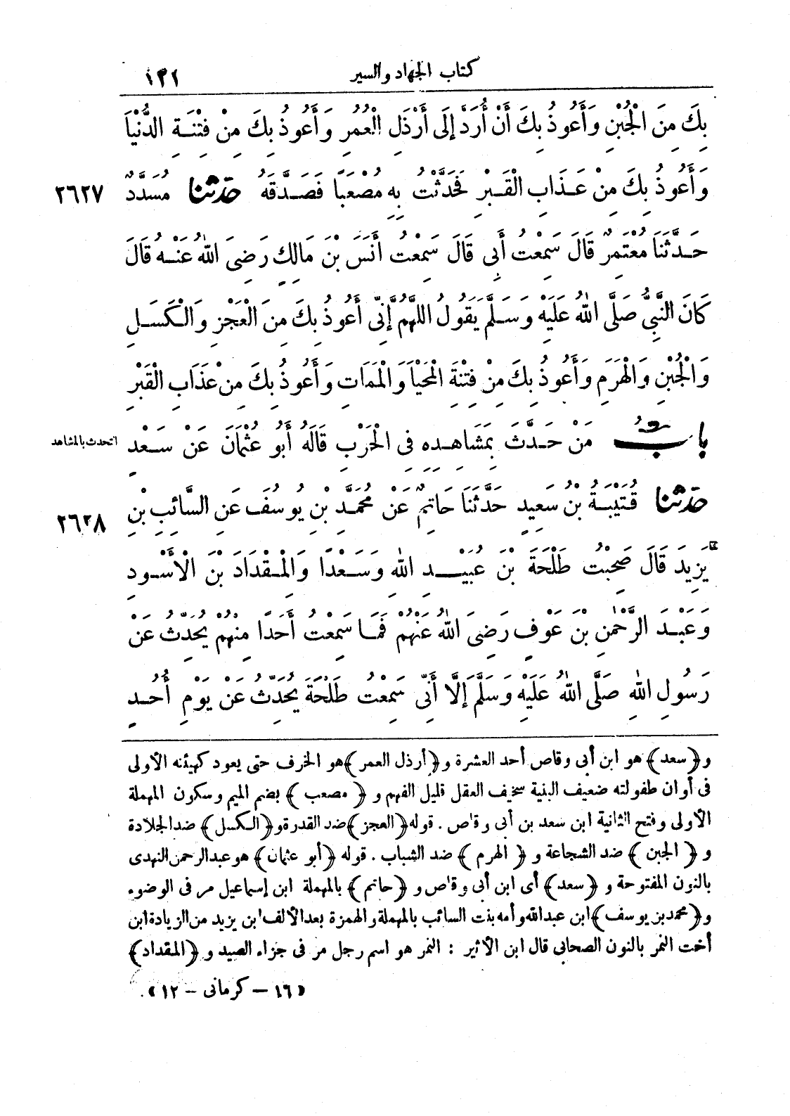 و (سعد) هو ابن أبي وقاص أحد العشرة و (أرذل العمر) هو الخرف حتى يعود كهيئته الأولى في أوان طفولته ضعيف البنية سخيف العقل قليل الفهم و (مصعب) بضم الميم وسكون المهملة الأولى وفتح الثانية ابن سعد بن أبي وقاص. قوله (العجز) ضد القدرة و (الكسل) ضد الجلادة و (الجبن) ضد الشجاعة و (الهرم) ضد الشباب. قوله (أبو عثمان) هو عبد الرحمن النهدي بالنون المفتوحة و (سعد) أي ابن أبي وقاص و (حاتم) بالمهملة ابن إسماعيل مر في الوضوء و (محمد بن يوسف) ابن عبد الله وأمه بنت السائب بالمهملة والهمزة بعد الألف بن يزيد من الزيادة ابن أخت النمر بالنون الصحابي قال ابن الأثير: النمر هو اسم رجل مر في جزاء الصيد (والمقداد)