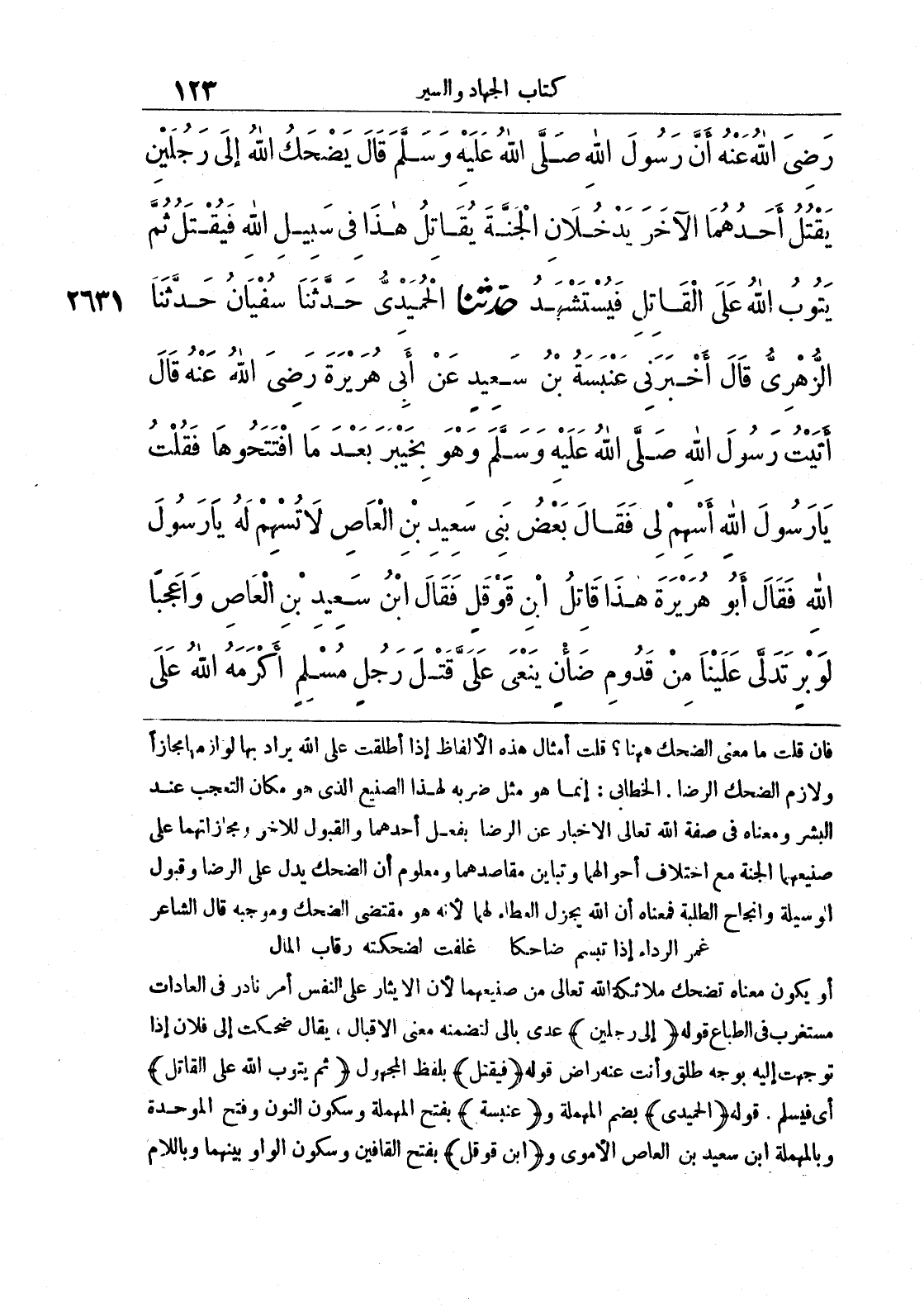 أو يكون معناه تضحك ملائكة الله تعالى من صنيعهما لأن الإيثار على النفس أمر نادر في العادات مستغرب في الطباع قوله (إلى رجلين) عدى بالي لتضمنه معنى الإقبال، يقال ضحكت إلى فلان إذا توجهت إليه بوجه طلق وأنت عنه راض قوله (فيقتل) بلفظ المجهول (ثم يتوب الله على القاتل) أي فيسلم. قوله (الحميدي) بضم المهملة و (عنبسة) بفتح المهملة وسكون النون وفتح الموحدة وبالمهملة ابن سعيد بن العاص الأموي (ابن قوقل) بفتح القافين وسكون الواو بينهما وباللام