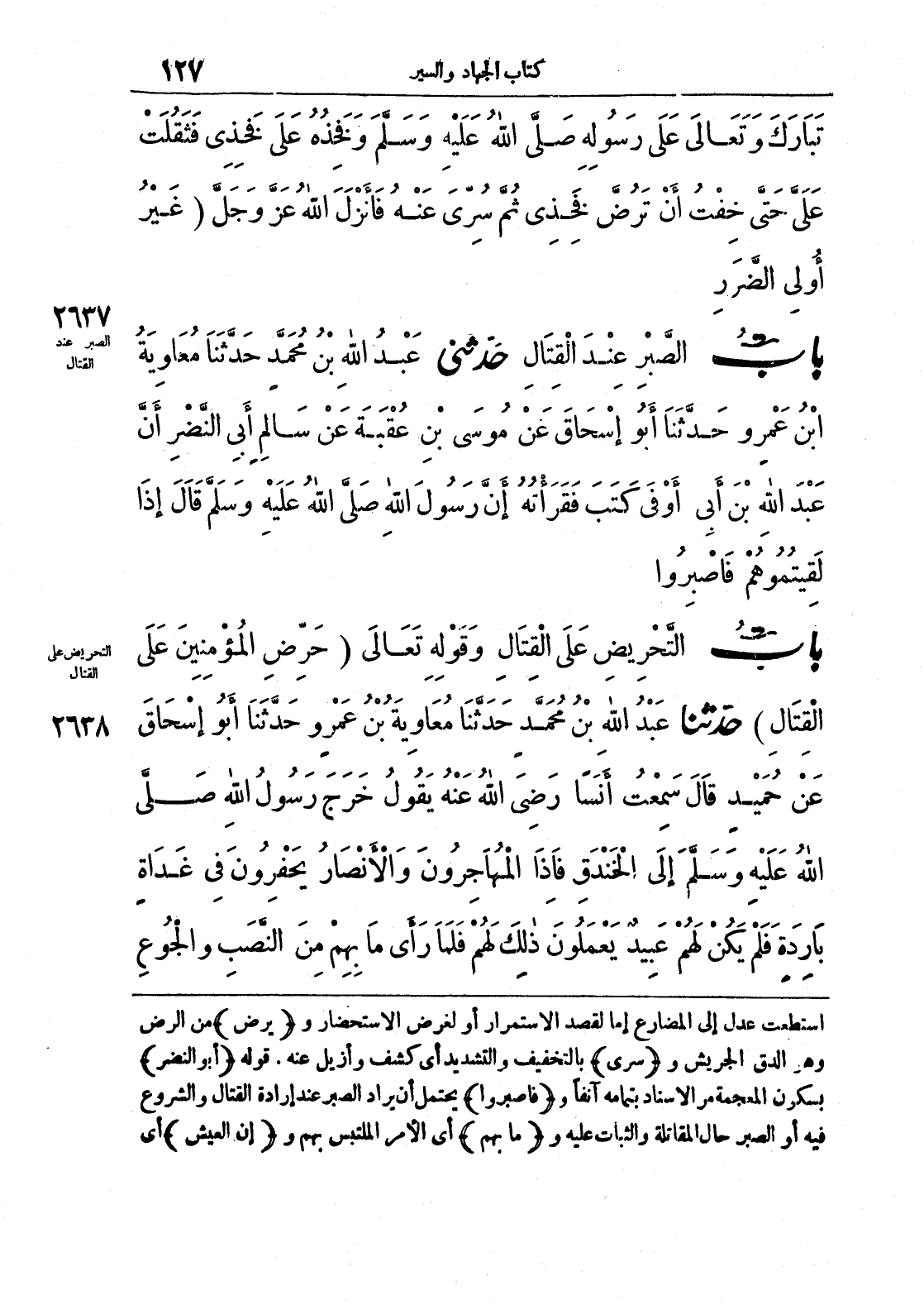 2637 - حَدَّثَنِي عَبْدُ اللَّهِ بْنُ مُحَمَّدٍ حَدَّثَنَا مُعَاوِيَةُ بْنُ عَمْرٍو حَدَّثَنَا أَبُو إِسْحَاقَ عَنْ مُوسَى بْنِ عُقْبَةَ عَنْ سَالِمٍ أَبِي النَّضْرِ أَنَّ عَبْدَ اللَّهِ بْنَ أَبِي أَوْفَى كَتَبَ فَقَرَاتُهُ إِنَّ رَسُولَ اللَّهِ صَلَّى اللَّهُ عَلَيْهِ وَسَلَّمَ قَالَ إِذَا لَقِيتُمُوهُمْ فَاصْبِرُوا