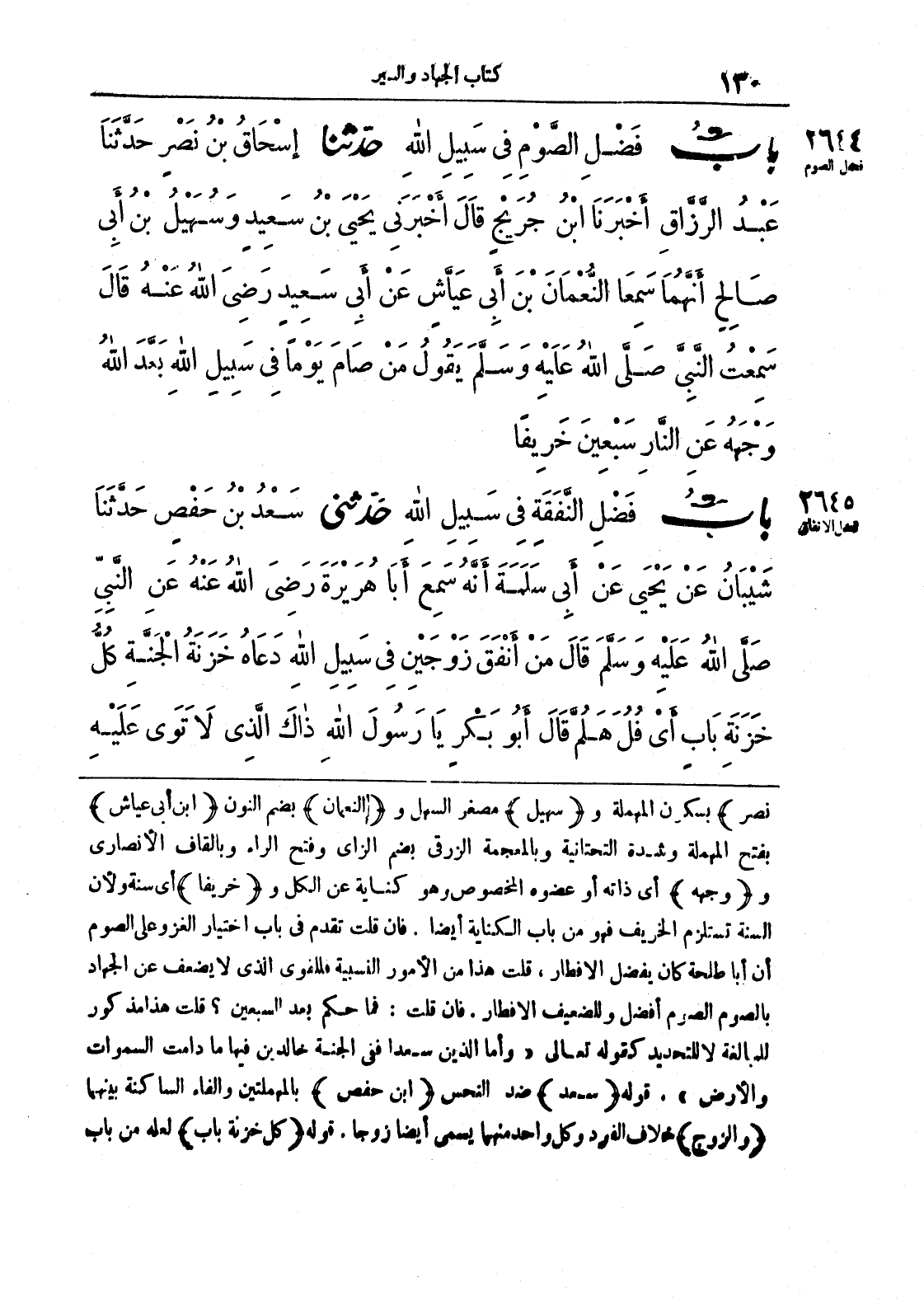 نصر) بسكون المهملة و (سهيل) مصغر السهل و (النعمان) بضم النون (ابن أبي عياش) بفتح المهملة وشدة التحتانية وبالمعجمة الزرقى بضم الزاي وفتح الراء وبالقاف الأنصاري و (وجهه) أي ذاته أو عضوه المخصوص وهو كناية عن الكل و (خريفاً) أي سنة ولأن السنة تستلزم الخريف فهو من باب الكناية أيضاً. فإن قلت تقدم في باب اختيار الغزو على الصوم أن أبا طلحة كان يفضل الإفطار، قلت هذا من الأمور النسبية فللقوي الذي لا يضعف عن الجهاد بالصوم الصوم أفضل وللضعيف الإفطار. فإن قلت: فما حكم بعد السبعين؟ قلت هذا مذكور للمبالغة لا للتحديد كقوله تعالى ((وأما الذين سعدا ففي الجنة خالدين فيها ما دامت السموات والأرض)). قوله (سعد) ضد النحس (ابن حفص) بالمهملتين والفاء الساكنة بينهما و (الزوج) خلاف الفرد وكل واحد منهما يسمى أيضاً زوجاً. قوله (كل خزنة باب) لعله من باب