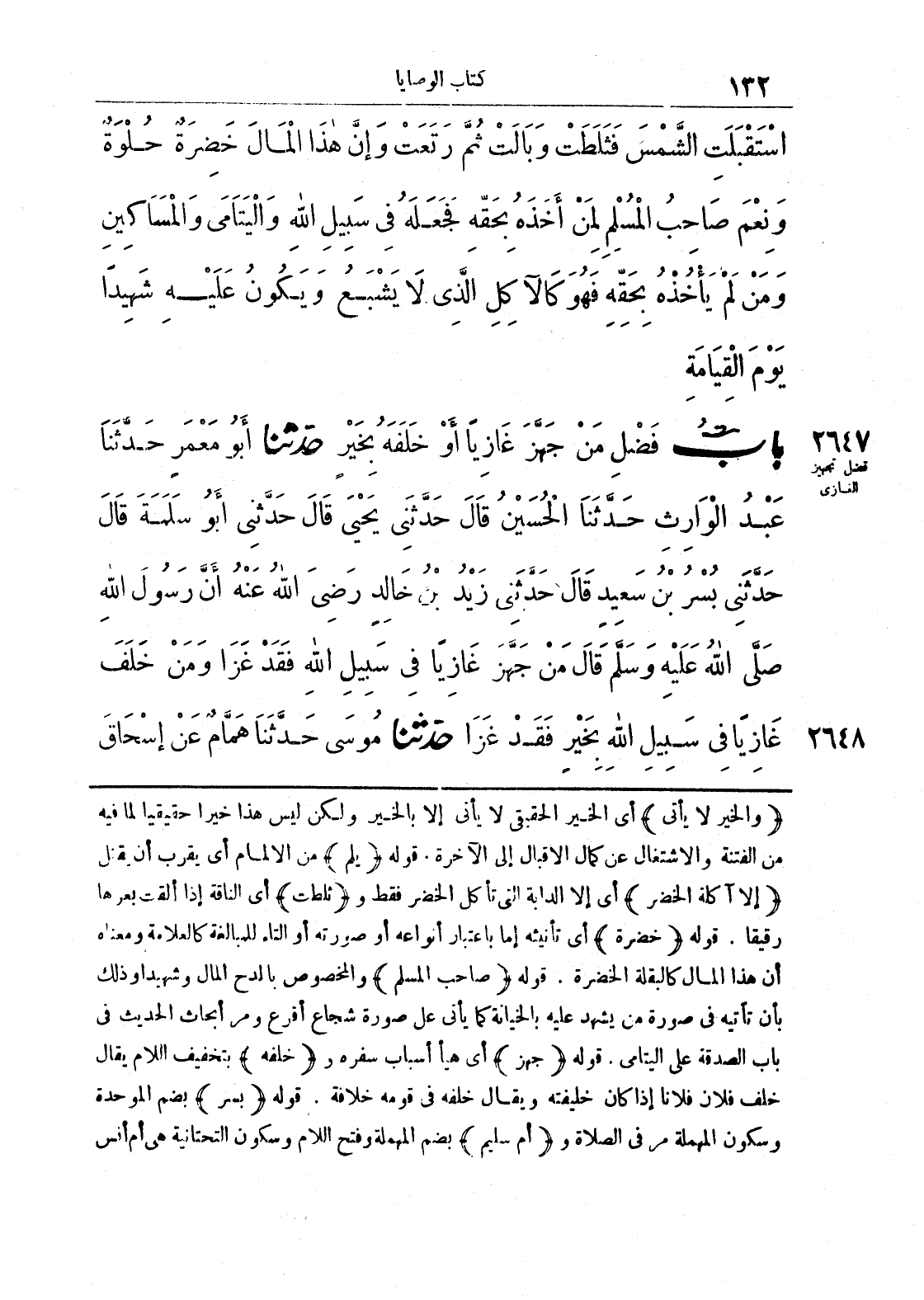 2647 - حَدَّثَنَا أَبُو مَعْمَرٍ حَدَّثَنَا عَبْدُ الْوَارِثِ حَدَّثَنَا الْحُسَيْنُ قَالَ حَدَّثَنِي يَحْيَى قَالَ حَدَّثَنِي أَبُو سَلَمَةَ قَالَ حَدَّثَنِي بُسْرُ بْنُ سَعِيدٍ قَالَ حَدَّثَنِي زَيْدُ بْنُ خَالِدٍ رَضِيَ اللَّهُ عَنْهُ أَنَّ رَسُولَ اللَّهِ صَلَّى اللَّهُ عَلَيْهِ وَسَلَّمَ قَالَ مَنْ جَهَّزَ غَازِيًا فِي سَبِيلِ اللَّهِ فَقَدْ غَزَا وَمَنْ خَلَفَ غَازِيًا فِي سَبِيلِ اللَّهِ بِخَيْرٍ فَقَدْ غَزَا