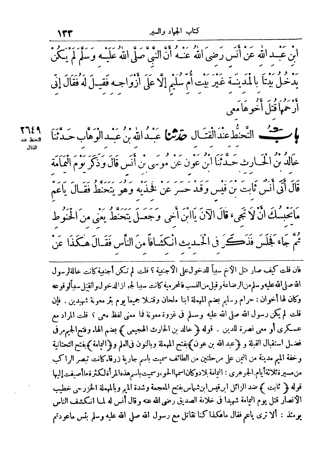 2649 - حَدَّثَنَا عَبْدُ اللَّهِ بْنُ عَبْدِ الْوَهَّابِ حَدَّثَنَا خَالِدُ بْنُ الْحَارِثِ حَدَّثَنَا ابْنُ عَوْنٍ عَنْ مُوسَى بْنِ أَنَسٍ قَالَ وَذَكَرَ يَوْمَ الْيَمَامَةِ قَالَ أَتَى أَنَسٌ ثَابِتَ بْنَ قَيْسٍ وَقَدْ حَسَرَ عَنْ فَخِذَيْهِ وَهُوَ يَتَحَنَّطُ فَقَالَ يَا عَمِّ مَا يَحْبِسُكَ أَنْ لَا تَجِيءَ قَالَ الْآنَ يَا ابْنَ أَخِي وَجَعَلَ يَتَحَنَّطُ يَعْنِي مِنْ الْحَنُوطِ ثُمَّ جَاءَ فَجَلَسَ فَذَكَرَ فِي الْحَدِيثِ انْكِشَافًا مِنْ النَّاسِ فَقَالَ هَكَذَا عَنْ
