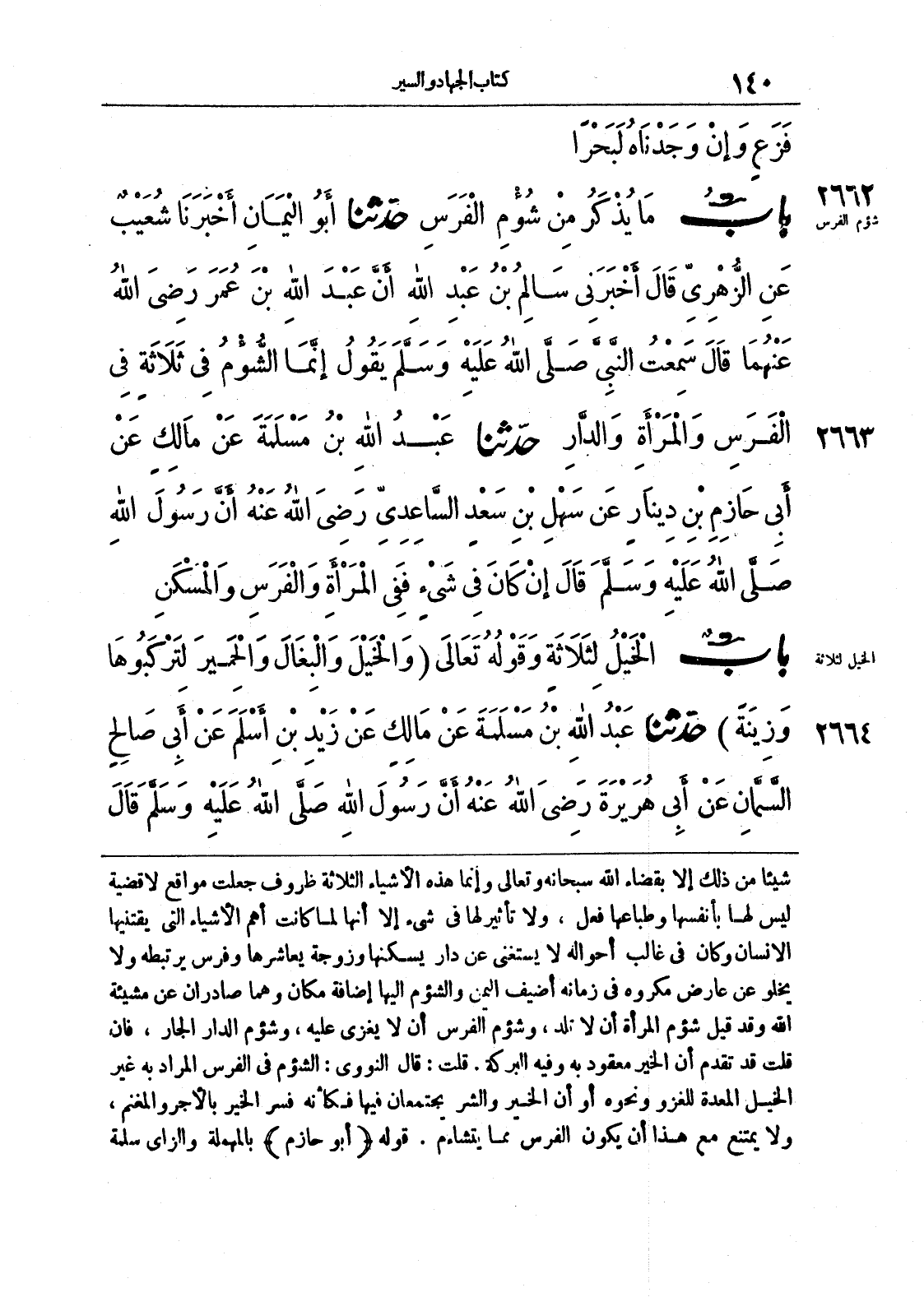 شيئاً من ذلك إلا بقضاء الله سبحانه وتعالى وإنما هذه الأشياء الثلاثة ظروف جعلت مواقع لا قضية ليس لها بأنفسها وطباعها فعل، ولا تأثيرها لها في شيء إلا أنها لما كانت أهم الأشياء التي يقتنيها الإنسان وكان في غالب أحواله لا يستغنى عن دار يسكنها وزوجة يعاشرها وفرس يرتبطه ولا يخلو عن عارض مكروه في زمانه أضيف اليمن والشؤم إليها إضافة مكان وهما صادران عن مشيئة الله وقد قيل شؤم المرأة أن لا تلد، وشؤم الفرس أن لا يغزى عليه، وشؤم الدار الجار، فإن قلت قد تقدم أن الخير معقود به وفيه البركة. قلت: قال النووي: الشؤم في الفرس المراد به غير الخيل المعدة للغزو ونحو أو أن الخير والشر يجتمعان فيها فكأنه فسر الخير بالأجر والمغنم، ولا يمتنع مع هذا أن يكون الفرس مما يتشاءم. قوله (أبو حازم) بالمهملة والزاي سلمة