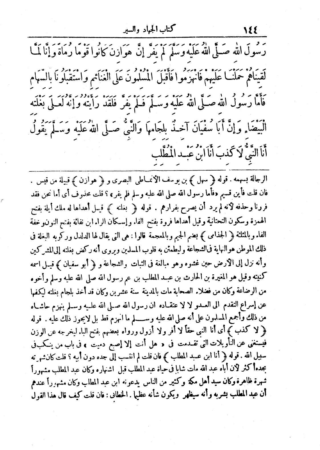رَسُولَ اللَّهِ صَلَّى اللَّهُ عَلَيْهِ وَسَلَّمَ لَمْ يَفِرَّ إِنَّ هَوَازِنَ كَانُوا قَوْمًا رُمَاةً وَإِنَّا لَمَّا لَقِينَاهُمْ حَمَلْنَا عَلَيْهِمْ فَانْهَزَمُوا فَأَقْبَلَ الْمُسْلِمُونَ عَلَى الْغَنَائِمِ وَاسْتَقْبَلُونَا بِالسِّهَامِ فَأَمَّا رَسُولُ اللَّهِ صَلَّى اللَّهُ عَلَيْهِ وَسَلَّمَ فَلَمْ يَفِرَّ فَلَقَدْ رَأَيْتُهُ وَإِنَّهُ لَعَلَى بَغْلَتِهِ الْبَيْضَاءِ وَإِنَّ أَبَا سُفْيَانَ آخِذٌ بِلِجَامِهَا وَالنَّبِيُّ صَلَّى اللَّهُ عَلَيْهِ وَسَلَّمَ يَقُولُ أَنَا النَّبِيُّ لَا كَذِبْ أَنَا ابْنُ عَبْدِ الْمُطَّلِبْ