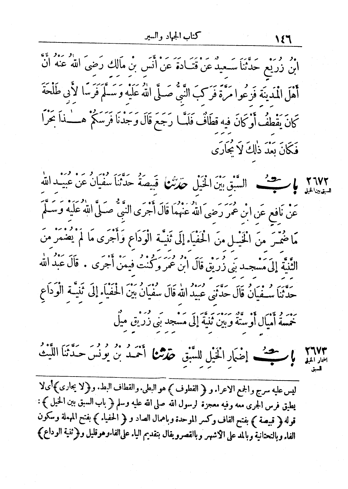 2672 - حَدَّثَنَا قَبِيصَةُ حَدَّثَنَا سُفْيَانُ عَنْ عُبَيْدِ اللَّهِ عَنْ نَافِعٍ عَنْ ابْنِ عُمَرَ رَضِيَ اللَّهُ عَنْهُمَا قَالَ أَجْرَى النَّبِيُّ صَلَّى اللَّهُ عَلَيْهِ وَسَلَّمَ مَا ضُمِّرَ مِنْ الْخَيْلِ مِنْ الْحَفْيَاءِ إِلَى ثَنِيَّةِ الْوَدَاعِ وَأَجْرَى مَا لَمْ يُضَمَّرْ مِنْ الثَّنِيَّةِ إِلَى مَسْجِدِ بَنِي زُرَيْقٍ قَالَ ابْنُ عُمَرَ وَكُنْتُ فِيمَنْ أَجْرَى قَالَ عَبْدُ اللَّهِ حَدَّثَنَا سُفْيَانُ قَالَ حَدَّثَنِي عُبَيْدُ اللَّهِ قَالَ سُفْيَانُ بَيْنَ الْحَفْيَاءِ إِلَى ثَنِيَّةِ الْوَدَاعِ خَمْسَةُ أَمْيَالٍ أَوْ سِتَّةٌ وَبَيْنَ ثَنِيَّةَ إِلَى مَسْجِدِ بَنِي زُرَيْقٍ مِيلٌ