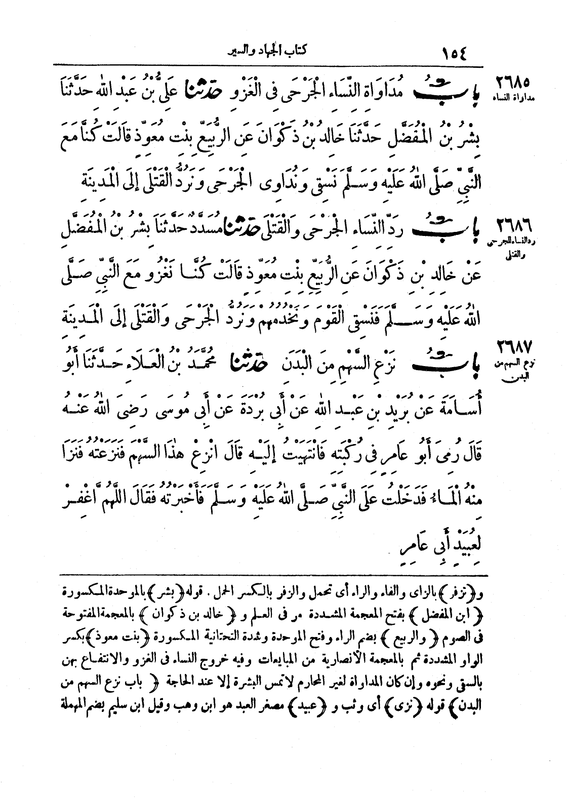 و (تزفر) بالزاي والفاء والراء أي تحمل والزفر بالكسر الحمل. قوله (بشر) بالموحدة المكسورة (ابن المفضل) بفتح المعجمة المشددة مر في العلم و (خالد بن ذكوان) بالمعجمة المفتوحة في الصوم (والربيع) بضم الراء وفتح الموحدة وشدة التحتانية المكسورة (بنت معوذ) بكسر الواو المشددة ثم بالمعجمة الأنصارية من المبايعات وفيه خروج النساء في الغزو والانتفاع بهن بالسقى ونحوه وإن كان المداواة لغير المحارم لا تمس البشرة إلا عند الحاجة (باب نزع السهم من البدن) قوله (نزى) أي وثب و (عبيد) مصغر العبد هو ابن وهب وقيل ابن سليم بضم المهملة