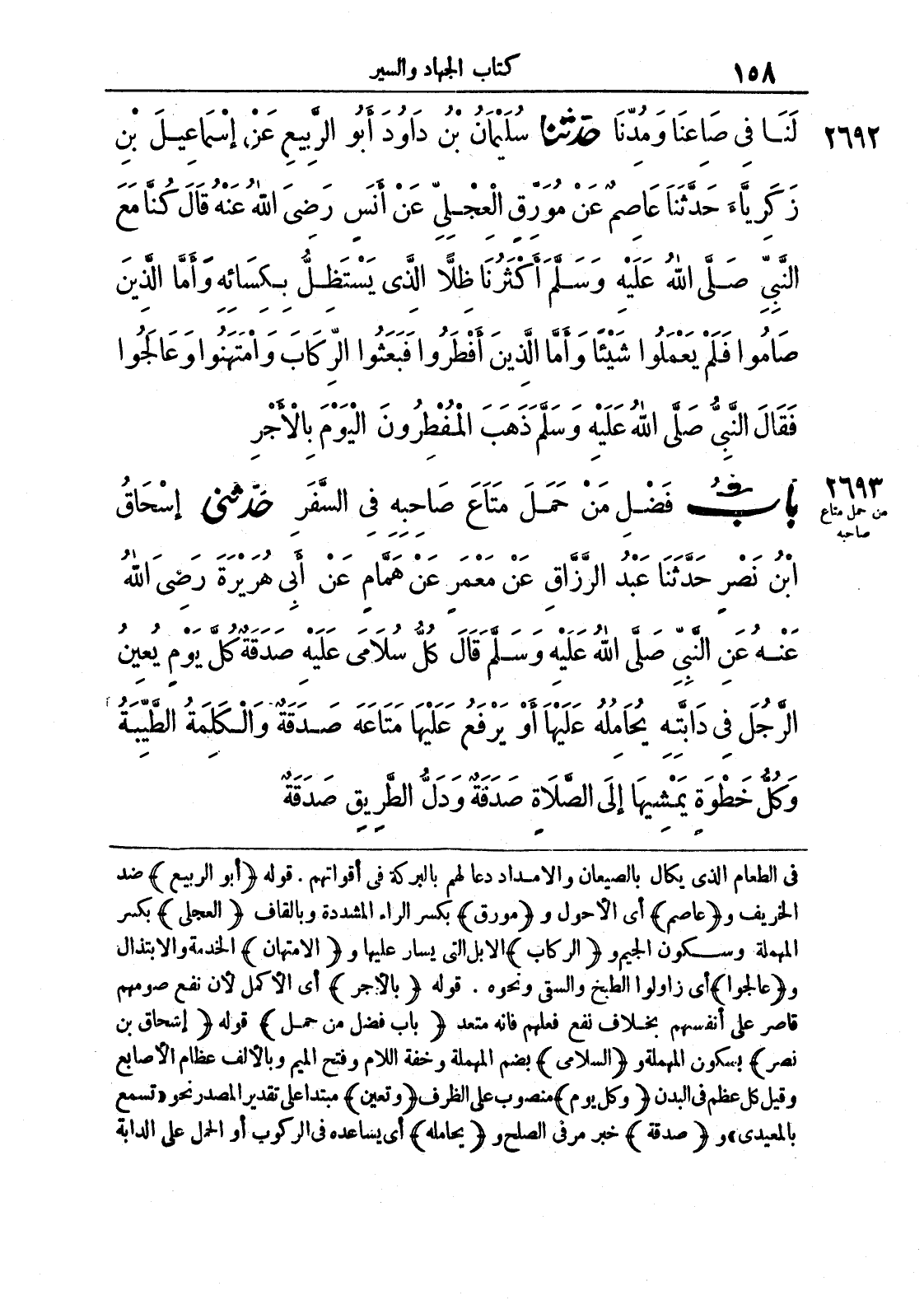 2693 - حَدَّثَنِي إِسْحَاقُ بْنُ نَصْرٍ حَدَّثَنَا عَبْدُ الرَّزَّاقِ عَنْ مَعْمَرٍ عَنْ هَمَّامٍ عَنْ أَبِي هُرَيْرَةَ رَضِيَ اللَّهُ عَنْهُ عَنْ النَّبِيِّ صَلَّى اللَّهُ عَلَيْهِ وَسَلَّمَ قَالَ كُلُّ سُلَامَى عَلَيْهِ صَدَقَةٌ كُلَّ يَوْمٍ يُعِينُ الرَّجُلَ فِي دَابَّتِهِ يُحَامِلُهُ عَلَيْهَا أَوْ يَرْفَعُ عَلَيْهَا مَتَاعَهُ صَدَقَةٌ وَالْكَلِمَةُ الطَّيِّبَةُ وَكُلُّ خَطْوَةٍ يَمْشِيهَا إِلَى الصَّلَاةِ صَدَقَةٌ وَدَلُّ الطَّرِيقِ صَدَقَةٌ