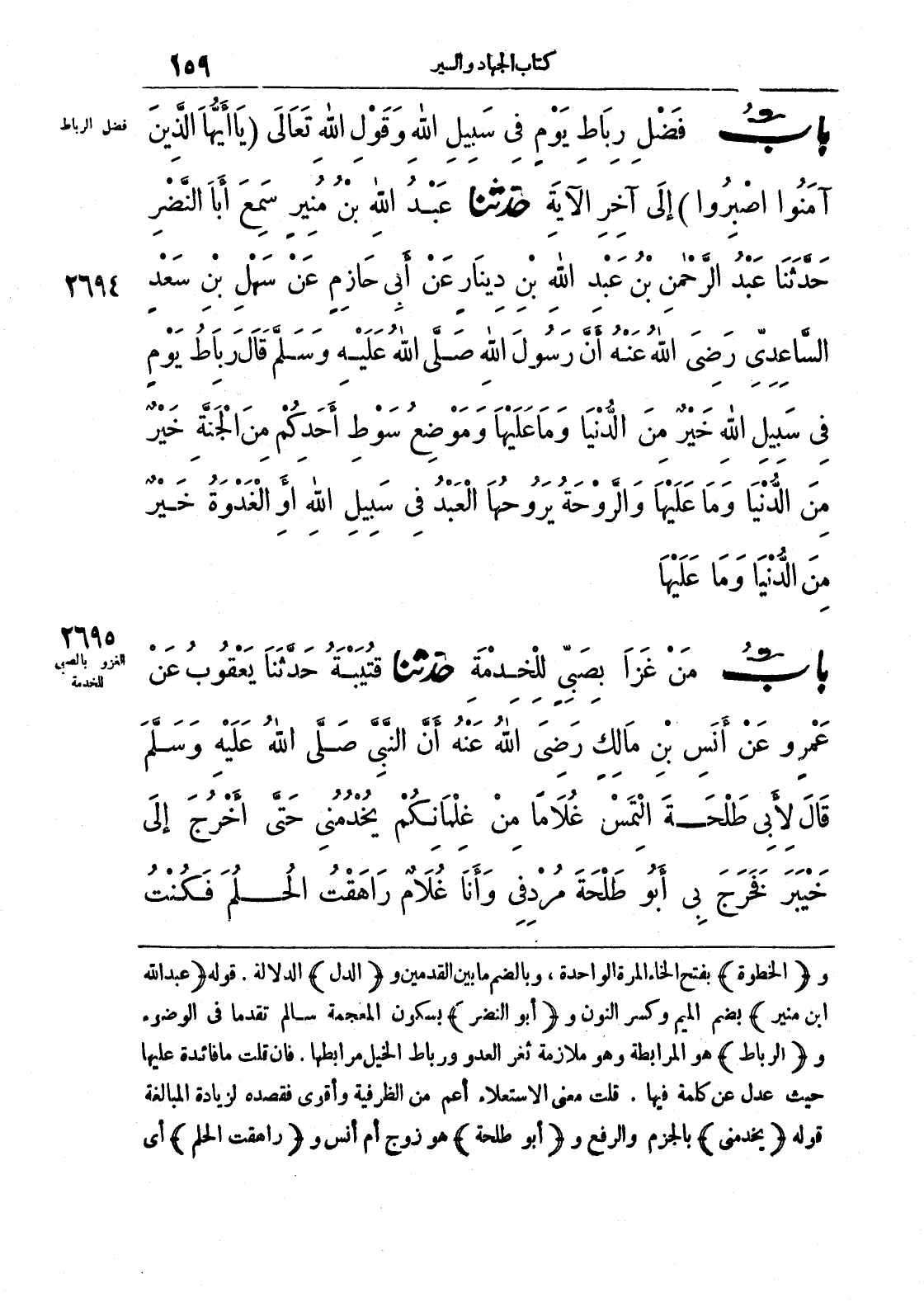 و (الخطوة) بفتح الخاء المرة الواحدة، وبالضم ما بين القدمين و (الدل) الدلالة. قوله (عبد الله ابن منير) بضم الميم وكسر النون و (أبو النضر) بسكون المعجمة سالم تقدما في الوضوء و (الرباط) هو المرابطة وهو ملازمة ثغر العدو ورباط الخيل مرابطها. فإن قلت ما فائدة عليها حيث عدل عن كلمة فيها. قلت معنى الاستعلاء أعم من الظرفية وأقوى فقصده لزيادة المبالغة قوله (يخدمني) بالجزم والرفع و (أبو طلحة) هو زوج أم أنس و (راهقت الحلم) أي