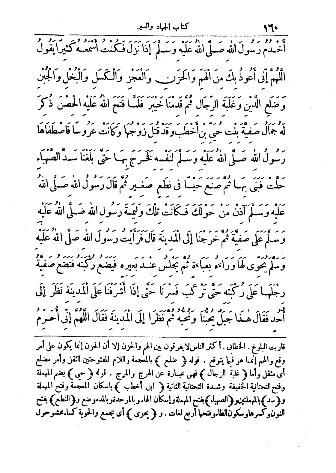 أَخْدُمُ رَسُولَ اللَّهِ صَلَّى اللَّهُ عَلَيْهِ وَسَلَّمَ إِذَا نَزَلَ فَكُنْتُ أَسْمَعُهُ كَثِيرًا يَقُولُ اللَّهُمَّ إِنِّي أَعُوذُ بِكَ مِنْ الْهَمِّ وَالْحَزَنِ وَالْعَجْزِ وَالْكَسَلِ وَالْبُخْلِ وَالْجُبْنِ وَضَلَعِ الدَّيْنِ وَغَلَبَةِ الرِّجَالِ ثُمَّ قَدِمْنَا خَيْبَرَ فَلَمَّا فَتَحَ اللَّهُ عَلَيْهِ الْحِصْنَ ذُكِرَ لَهُ جَمَالُ صَفِيَّةَ بِنْتِ حُيَيِّ بْنِ أَخْطَبَ وَقَدْ قُتِلَ زَوْجُهَا وَكَانَتْ عَرُوسًا فَاصْطَفَاهَا رَسُولُ اللَّهِ صَلَّى اللَّهُ عَلَيْهِ وَسَلَّمَ لِنَفْسِهِ فَخَرَجَ بِهَا حَتَّى بَلَغْنَا سَدَّ الصَّهْبَاءِ حَلَّتْ فَبَنَى بِهَا ثُمَّ صَنَعَ حَيْسًا فِي نِطَعٍ صَغِيرٍ ثُمَّ قَالَ رَسُولُ اللَّهِ صَلَّى اللَّهُ عَلَيْهِ وَسَلَّمَ آذِنْ مَنْ حَوْلَكَ فَكَانَتْ تِلْكَ وَلِيمَةَ رَسُولِ اللَّهِ صَلَّى اللَّهُ عَلَيْهِ وَسَلَّمَ عَلَى صَفِيَّةَ ثُمَّ خَرَجْنَا إِلَى الْمَدِينَةِ قَالَ فَرَأَيْتُ رَسُولَ اللَّهِ صَلَّى اللَّهُ عَلَيْهِ وَسَلَّمَ يُحَوِّي لَهَا وَرَاءَهُ بِعَبَاءَةٍ ثُمَّ يَجْلِسُ عِنْدَ بَعِيرِهِ فَيَضَعُ رُكْبَتَهُ فَتَضَعُ صَفِيَّةُ رِجْلَهَا عَلَى رُكْبَتِهِ حَتَّى تَرْكَبَ فَسِرْنَا حَتَّى إِذَا أَشْرَفْنَا عَلَى الْمَدِينَةِ نَظَرَ إِلَى أُحُدٍ فَقَالَ هَذَا جَبَلٌ يُحِبُّنَا وَنُحِبُّهُ ثُمَّ نَظَرَ إِلَى الْمَدِينَةِ فَقَالَ اللَّهُمَّ إِنِّي أُحَرِّمُ