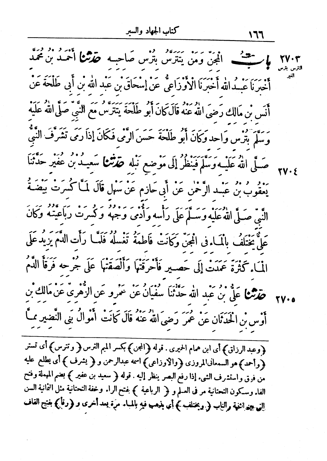 (وعبد الرزاق) أي ابن همام الحميري. قوله (المجن) بكسر الميم الترس (وتترس) أي تستر (وأحمد) هو السمعاني المروزي (والأوزاعي) اسمه عبد الرحمن و (يشرف) أي يطلع عليه من فوق واستشرف الشيء إذا رفع البصر ينظر إليه. قوله (سعيد بن عفير) بضم المهملة وفتح الفاء وسكون التحتانية مر في العلم و (الرباعية) بفتح الراء وخفة التحتانية مثل الثمانية السن التي بين الثنية والناب (ويختلف) أي يذهب فيه بالماء مرة بعد أخرى و (رقأ) بفتح القاف
