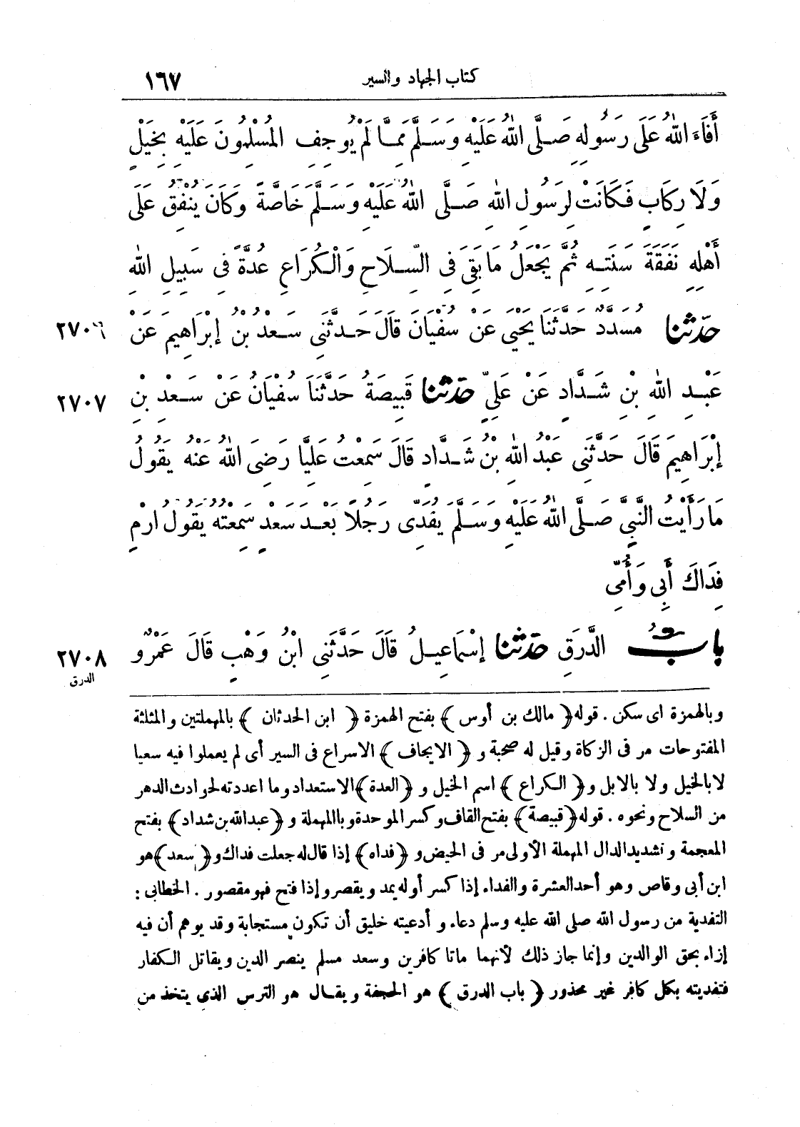 وبالهمزة أي سكن. قوله (مالك بن أوس) بفتح الهمزة (ابن الحدثان) بالمهملتين والمثلثة المفتوحات مر في الزكاة وقيل له صحبة و (الايجاف) الإسراع في السير أي لم يعلموا فيه سعياً لا بالخيل ولا بالإبل و (الكراع) اسم الخيل و (العدة) الاستعداد وما أعددته لحوادث الدهر من السلاح ونحوه. قوله (قبيصة) بفتح القاف وكسر الموحدة وبالمهملة و (عبد الله بن شداد) بفتح المعجمة وتشديد الدال المهملة الأولى مر في الحيض و (فداه) إذا قال له جعلت فداك و (سعد) هو ابن أبي وقاص وهو أحد العشرة والفداء إذا كسر أوله يمد ويقصر وإذا فتح فهو مقصور. الخطابي: التفدية من رسول الله صلى الله عليه وسلم دعاء وأدعيته خليق أن تكون مستجابة وقد يوهم أن فيه إزاء بحق الوالدين وإنما جاز ذلك لأنهما ماتا كافرين وسعد مسلم ينصر الدين ويقاتل الكفار فتفديته بكل كافر غير محذور (باب الدرق) هو الجحفة ويقال هو الترس الذي يتخذ من