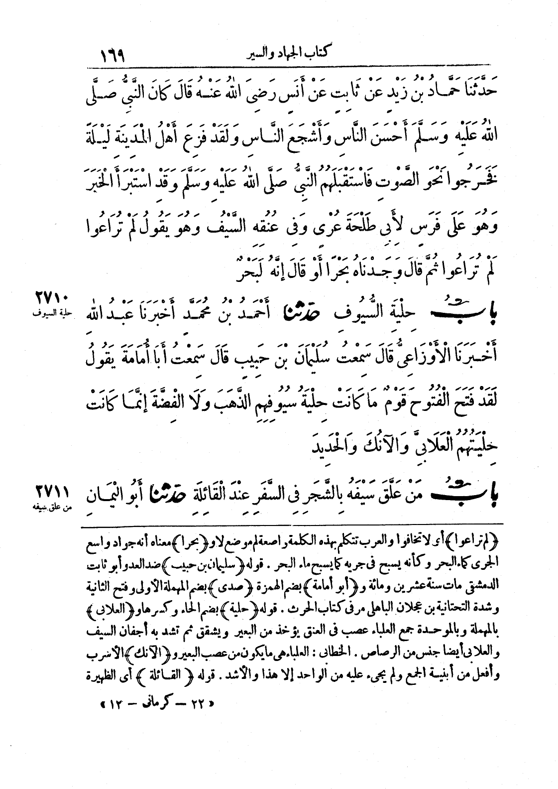 (لم تراعوا) أي لا تخافوا والعرب تتلكم بهذه الكلمة واضعة لم موضع لا و (بحراً) معناه أنه جواد واسع الجري كماء البحر وكأنه يسبح في جريه كما يسبح ماء البحر. قوله (سليمان بن حبيب) ضد العدو أبو ثابت الدمشقي مات سنة عشرين ومائة و (أبو أمامة) بضم الهمزة (صدى) بضم المهملة الأولى وفتح الثانية وشدة التحتانية بن عجلان الباهلي مر في كتاب الحرث. قوله (حلية) بضم الحاء وكسرها و (العلابي) بالمهمة وبالموحدة جمع العلباء عصب في العنق يؤخذ من البعير ويشقق ثم تشد به أجفان السيف والعلابي أيضاً جنس من الرصاص. الخطابي: العلباء هي ما يكون من عصب البعير و (الآنك) الأسرب وأفعل من أبنية الجمع ولم يجيء عليه من الواحد إلا هذا والأشد. قوله (القائلة) أي الظهيرة