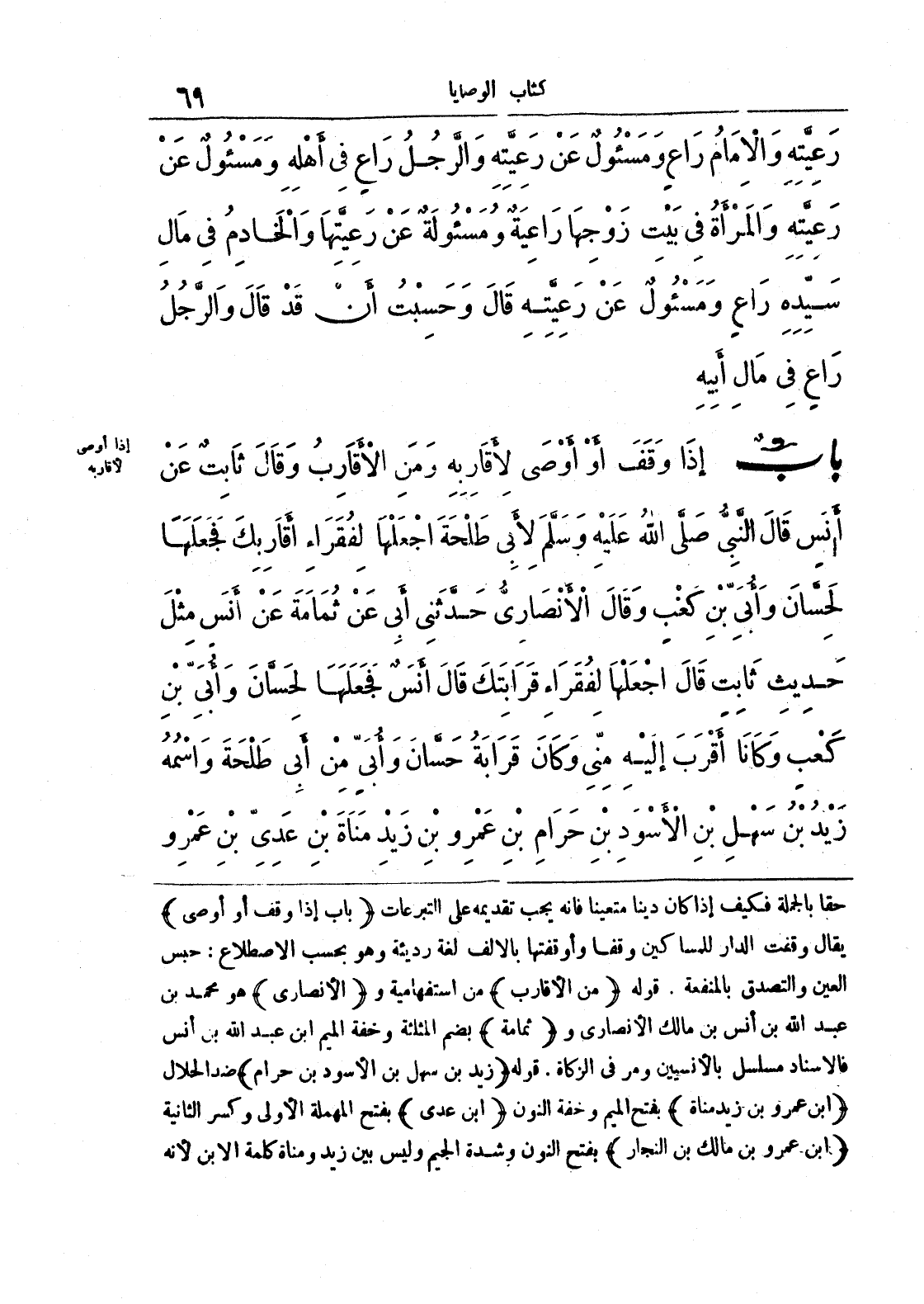 حقاً بالجملة فكيف إذا كان ديناً متعيناً فإنه يجب تقديمه على التبرعات (باب إذا وقف أو أوصى) يقال وقفت الدار للمساكين وقفاً وأوقفها بالألف لغة رديئة وهو بحسب الاصطلاح: حبس العين والتصدق بالمنفعة. قوله (من الأقارب) من استفهامية و (الأنصاري) هو محمد بن عبد الله بن أنس بن مالك الأنصاري و (ثمامة) بضم المثلثة وخفة الميم ابن عبد الله بن أنس فالإسناد مسلسل بالأنسيين ومر في الزكاة. قوله (زيد بن سهل بن الأسود بن حرام) ضد الحلال (ابن عمرو بن زيد مناة) بفتح الميم وخفة النون (ابن عدي) بفتح المهملة الأولى وكسر الثانية (ابن عمرو بن مالك بن النجار) بفتح النون وشدة الجيم وليس بين زيد ومناة كلمة الابن لأنه
