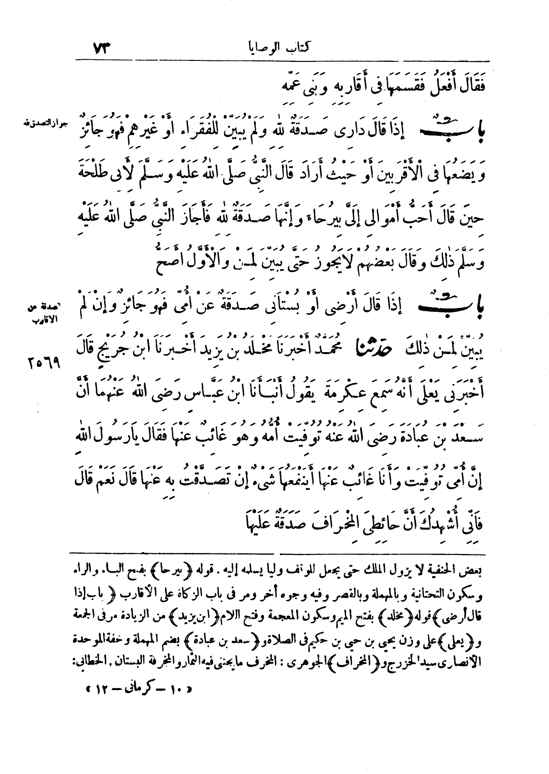 بعض الحنفية لا يزول الملك حتى يجعل الموقف ولياً يسلمه إليه. قوله (يبرحا) يفتح الباء والراء وسكون التحتانية وبالمهملة وبالقصر وفيه وجوه أخر ومر في باب الزكاة على الأقارب (باب إذا قال أرضى) قوله (مخلد) بفتح الميم وسكون المعجمة وفتح اللام (ابن يزيد) من الزيادة مر في الجمعة و (يعلى) على وزن يحيي بن حي بن حكيم في الصلاة و (سعد بن عبادة) بضم المهملة وخفة الموحدة الأنصاري سيد الخزرج و (المخراف) الجوهري: المخرف ما يجتني فيه الثمار والمخرفة البستان. الخطابي: