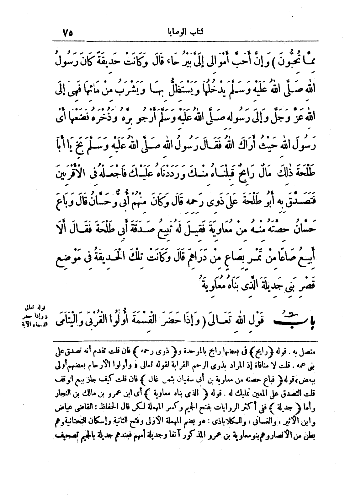 متصل به. قوله (رايح) في بعضها رابح بالموحدة و (ذوى رحمة) فإن قلت تقدم أنه تصدق على بني عمه. قلت لا منافاة إذ المراد بذوي الرحم القرابة لقوله تعالى ((وأولوا الأرحام بعضهم أولى ببعض)) قوله (فباع حصته من معاوية بن أبي سفيان بثمن غال) فإن قلت كيف جاز بيع الوقف قلت التصدق على المعين تمليك له. قوله (الذي بناه معاوية) أي ابن عمرو بن مالك بن النجار وأما (جديلة) ففي أكثر الروايات بفتح الجيم وكسر المهملة لكن قال الحفاظ: القاضي عياض وابن الأثير، والغساني، والكلاباذي: هو بضم المهملة الأولى وفتح الثانية وإسكان التحتانية وهم بطن من الأنصار وهم بنو معاوية بن عمرو المذكور آنفاً وجديلة أمهم فعندهم جديلة بالجيم تصحيف