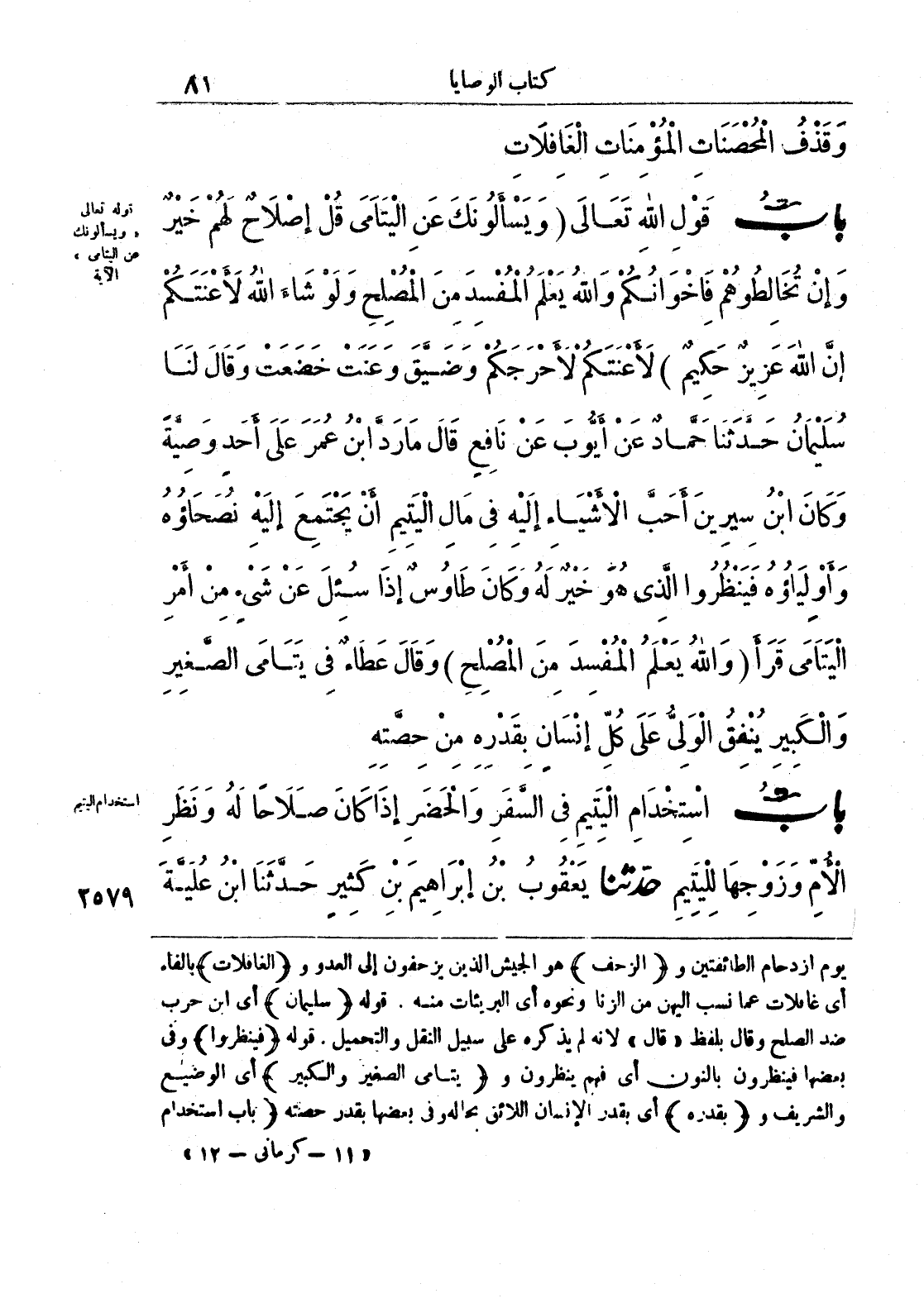 يوم ازدحام الطائفتين و (الزحف) هو الجيش الذين يزحفون إلى العدو و (الغافلات) بالفاء أي غافلات عما نسب إليهن من الزنا ونحوه أي البريئات منه. قوله (سليمان) أي ابن حرب ضد الصلح وقال بلفظ ((قال)) لأنه لم يذكره على سبيل النقل والتحميل. قوله (فينظروا) وفي بعضها فينظرون بالنون أي فهم ينظرون و (يتامى الصغير والكبير) أي الوضيع والشريف و (بقدره) أي بقدر الإنسان اللائق بحاله وفي بعضها بقدر حصته (باب استخدام