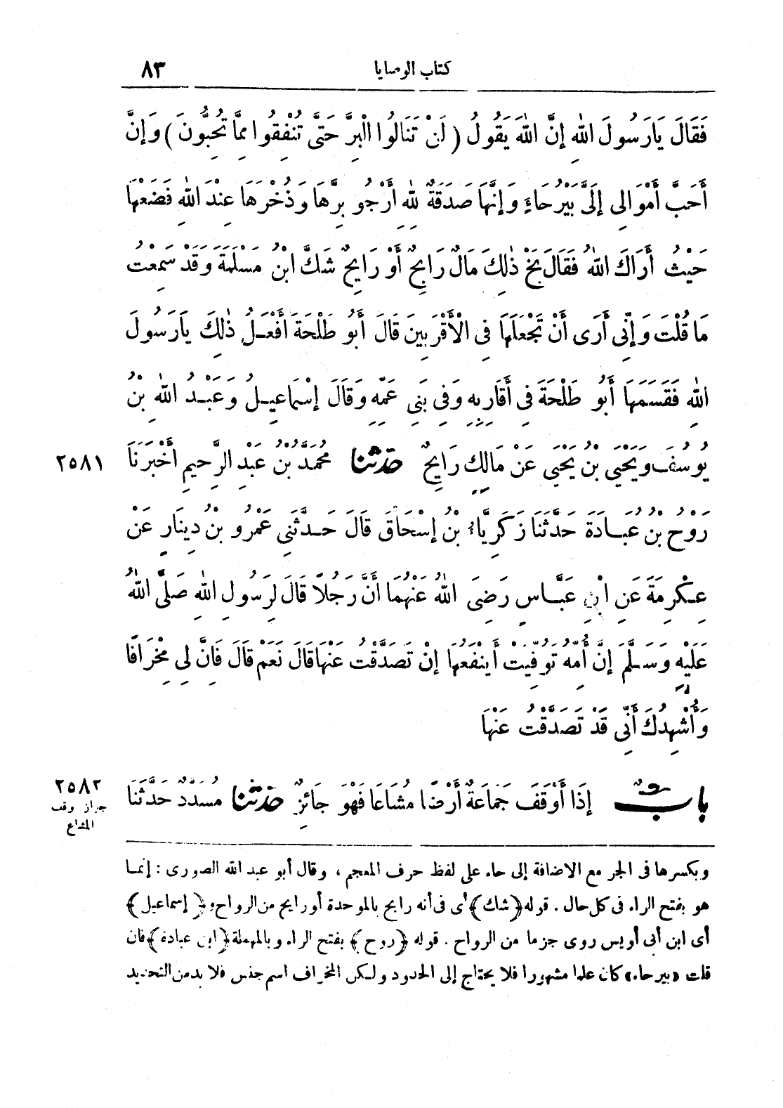وبكسرها في الجر مع الإضافة إلى حاء على لفظ حرف المعجم، وقال أبو عبد الله الصوري: إنما هو بفتح الراء في كل حال. قوله (شك) أي في أنه رابح بالموحدة أو رايح من الرواح و (إسماعيل) أي ابن أبي أويس روى جزماً من الرواح. قوله (روح) بفتح الراء وبالمهملة (ابن عبادة) فإن قلت ((بيرحاء)) كان علماً مشهوراً فلا يحتاج إلى الحدود ولكن المخراف اسم جنس فلابد من التحديد
