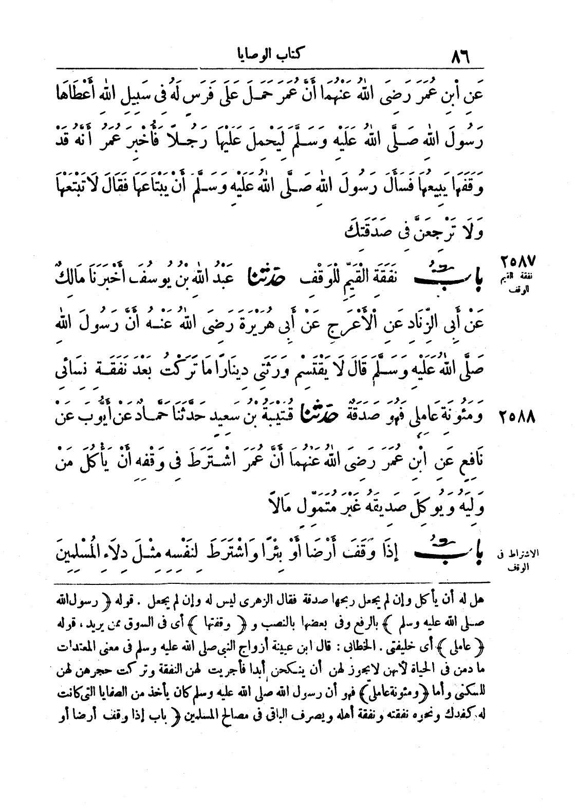 هل له أن يأكل وإن لم يجعل ربحها صدقة فقال الزهري ليس له وإن لم يجعل. قوله (رسول الله صلى الله عليه وسلم) بالرفع وفي بعضها بالنصب و (وقفتها) أي في السوق ممن يريد، قوله (عاملي) أي خليفتي. الخطابي: قال ابن عيينة أزواج النبي صلى الله عليه وسلم في معنى المعتدات ما دمن في الحياة لأنهن لا يجوز لهن أن ينكحن أبداً فأجريت لهن النفقة وتركت حجرهن لهن للسكنى وأما (ومئونة عاملي) فهو أن رسول الله صلى الله عليه وسلم كان يأخذ من الصفايا التي كانت له كفدك ونحوه نفقته ونفقة أهله ويصرف الباقي في مصالح المسلمين (باب إذا وقف أرضاً أو