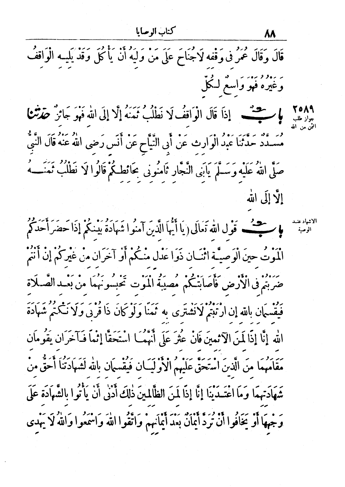 بَاب قَوْلِ اللَّهِ تَعَالَى {يَا أَيُّهَا الَّذِينَ آمَنُوا شَهَادَةُ بَيْنِكُمْ إِذَا حَضَرَ أَحَدَكُمْ الْمَوْتُ حِينَ الْوَصِيَّةِ اثْنَانِ ذَوَا عَدْلٍ مِنْكُمْ أَوْ آخَرَانِ مِنْ غَيْرِكُمْ إِنْ أَنْتُمْ ضَرَبْتُمْ فِي الْأَرْضِ فَأَصَابَتْكُمْ مُصِيبَةُ الْمَوْتِ تَحْبِسُونَهُمَا مِنْ بَعْدِ الصَّلَاةِ فَيُقْسِمَانِ بِاللَّهِ إِنْ ارْتَبْتُمْ لَا نَشْتَرِي بِهِ ثَمَنًا وَلَوْ كَانَ ذَا قُرْبَى وَلَا نَكْتُمُ شَهَادَةَ اللَّهِ إِنَّا إِذًا لَمِنْ الْآثِمِينَ فَإِنْ عُثِرَ عَلَى أَنَّهُمَا اسْتَحَقَّا إِثْمًا فَآخَرَانِ يَقُومَانِ مَقَامَهُمَا مِنْ الَّذِينَ اسْتُحِقَّ عَلَيْهِمْ الْأَوْلَيَانِ فَيُقْسِمَانِ بِاللَّهِ لَشَهَادَتُنَا أَحَقُّ مِنْ شَهَادَتِهِمَا وَمَا اعْتَدَيْنَا إِنَّا إِذًا لَمِنْ الظَّالِمِينَ ذَلِكَ أَدْنَى أَنْ يَاتُوا بِالشَّهَادَةِ عَلَى وَجْهِهَا أَوْ يَخَافُوا أَنْ تُرَدَّ أَيْمَانٌ بَعْدَ أَيْمَانِهِمْ وَاتَّقُوا اللَّهَ وَاسْمَعُوا وَاللَّهُ لَا يَهْدِي