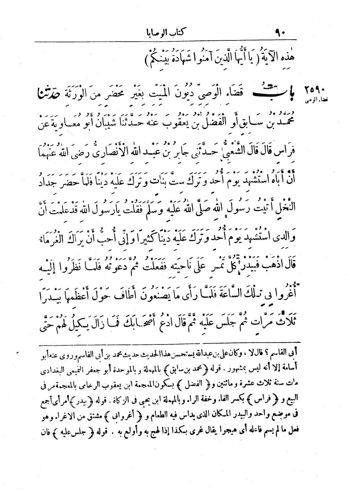 2590 - حَدَّثَنَا مُحَمَّدُ بْنُ سَابِقٍ أَوْ الْفَضْلُ بْنُ يَعْقُوبَ عَنْهُ حَدَّثَنَا شَيْبَانُ أَبُو مُعَاوِيَةَ عَنْ فِرَاسٍ قَالَ قَالَ الشَّعْبِيُّ حَدَّثَنِي جَابِرُ بْنُ عَبْدِ اللَّهِ الْأَنْصَارِيُّ رَضِيَ اللَّهُ عَنْهُمَا أَنَّ أَبَاهُ اسْتُشْهِدَ يَوْمَ أُحُدٍ وَتَرَكَ سِتَّ بَنَاتٍ وَتَرَكَ عَلَيْهِ دَيْنًا فَلَمَّا حَضَرَ جِدَادُ النَّخْلِ أَتَيْتُ رَسُولَ اللَّهِ صَلَّى اللَّهُ عَلَيْهِ وَسَلَّمَ فَقُلْتُ يَا رَسُولَ اللَّهِ قَدْ عَلِمْتَ أَنَّ وَالِدِي اسْتُشْهِدَ يَوْمَ أُحُدٍ وَتَرَكَ عَلَيْهِ دَيْنًا كَثِيرًا وَإِنِّي أُحِبُّ أَنْ يَرَاكَ الْغُرَمَاءُ قَالَ اذْهَبْ فَبَيْدِرْ كُلَّ تَمْرٍ عَلَى نَاحِيَتِهِ فَفَعَلْتُ ثُمَّ دَعَوْتُهُ فَلَمَّا نَظَرُوا إِلَيْهِ أُغْرُوا بِي تِلْكَ السَّاعَةَ فَلَمَّا رَأَى مَا يَصْنَعُونَ أَطَافَ حَوْلَ أَعْظَمِهَا بَيْدَرًا ثَلَاثَ مَرَّاتٍ ثُمَّ جَلَسَ عَلَيْهِ ثُمَّ قَالَ ادْعُ أَصْحَابَكَ فَمَا زَالَ يَكِيلُ لَهُمْ حَتَّى