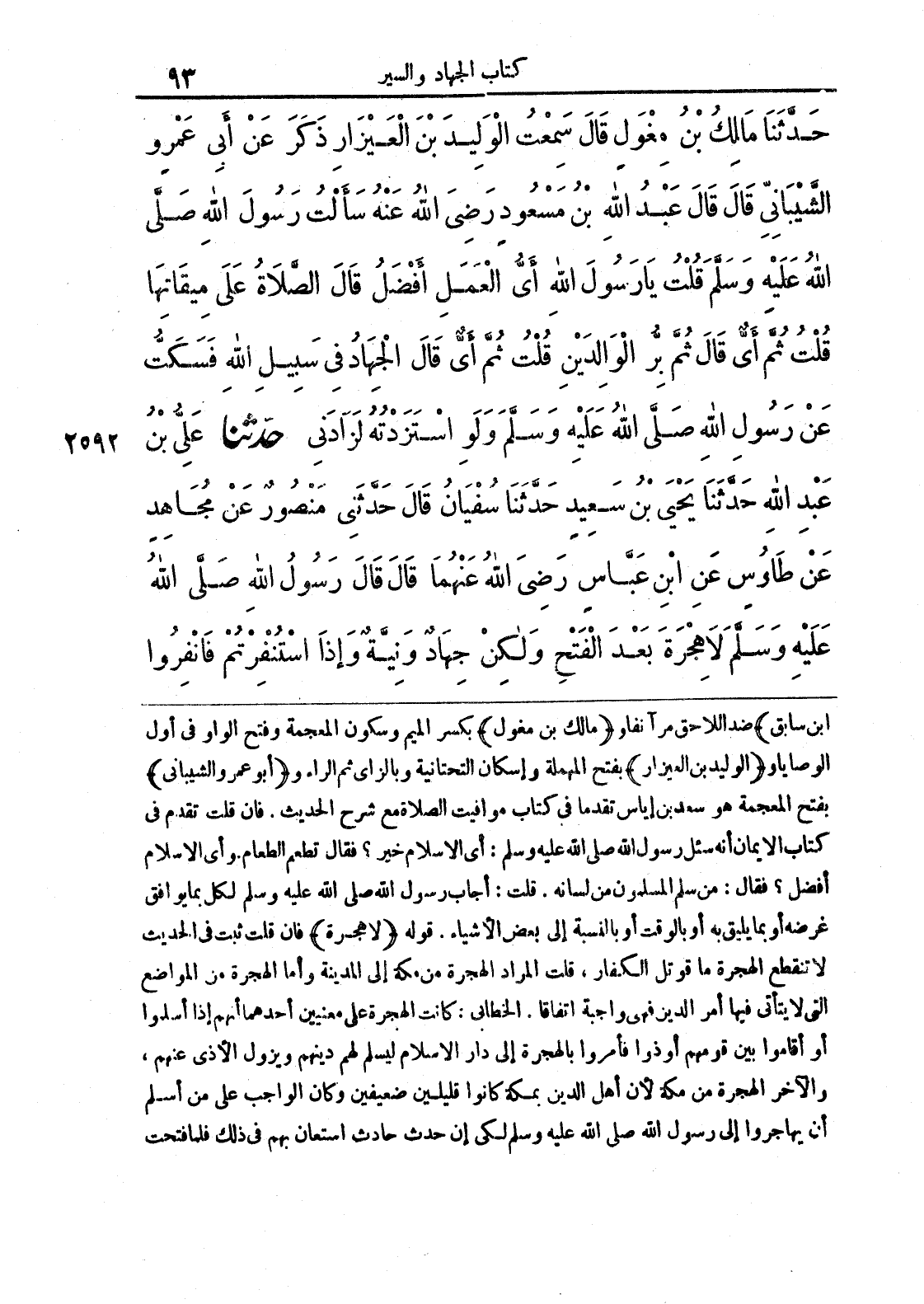 2592 - حَدَّثَنَا عَلِيُّ بْنُ عَبْدِ اللَّهِ حَدَّثَنَا يَحْيَى بْنُ سَعِيدٍ حَدَّثَنَا سُفْيَانُ قَالَ حَدَّثَنِي مَنْصُورٌ عَنْ مُجَاهِدٍ عَنْ طَاوُسٍ عَنْ ابْنِ عَبَّاسٍ رَضِيَ اللَّهُ عَنْهُمَا قَالَ قَالَ رَسُولُ اللَّهِ صَلَّى اللَّهُ عَلَيْهِ وَسَلَّمَ لَا هِجْرَةَ بَعْدَ الْفَتْحِ وَلَكِنْ جِهَادٌ وَنِيَّةٌ وَإِذَا اسْتُنْفِرْتُمْ فَانْفِرُوا