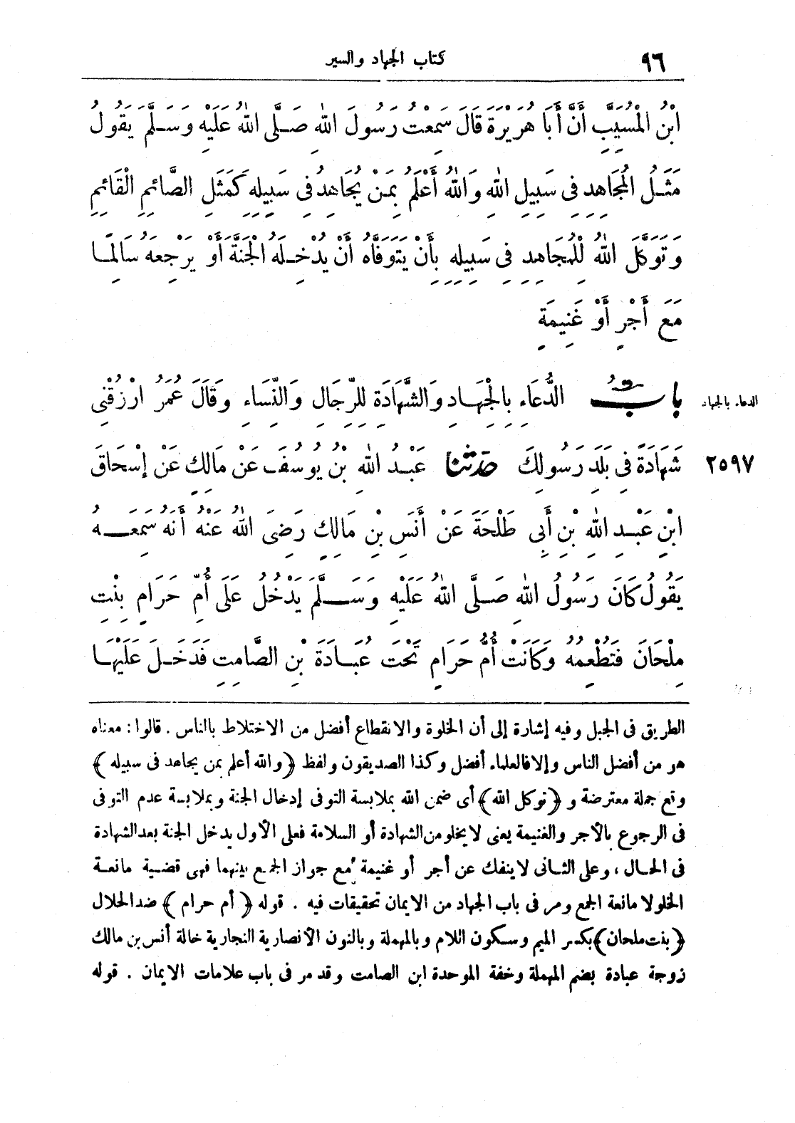 الطريق في الجبل وفيه إشارة إلى أن الخلوة والانقطاع أفضل من الاختلاط بالناس. قالوا: معناه هو من أفضل الناس وإلا فالعلماء أفضل وكذا الصديقون ولفظ (والله أعلم بمن يجاهد في سبيله) وقع جملة معترضة و (توكل الله) أي ضمن الله بملابسة التوفي إدخال الجنة وبملابسة عدم التوفي في الرجوع بالأجر والغنيمة يعني لا يخلو من الشهادة أو السلام فعلى الأول يدخل الجنة بعد الشهادة في الحال، وعلى الثاني لا ينفك عن أجر أو غنيمة مع جواز الجمع بينهما فهي قضية مانعة الخلو لا مانعة الجمع ومر في باب الجهاد من الإيمان تحقيقات فيه. قوله (أم حرام) ضد الحلال (بنت ملحان) بكسر الميم وسكون اللام وبالمهملة وبالنون الأنصارية النجارية خالد أنس بن مالك زوجة عبادة بضم المهملة وخفة الموحدة ابن الصامت وقد مر في باب علامات الإيمان. قوله