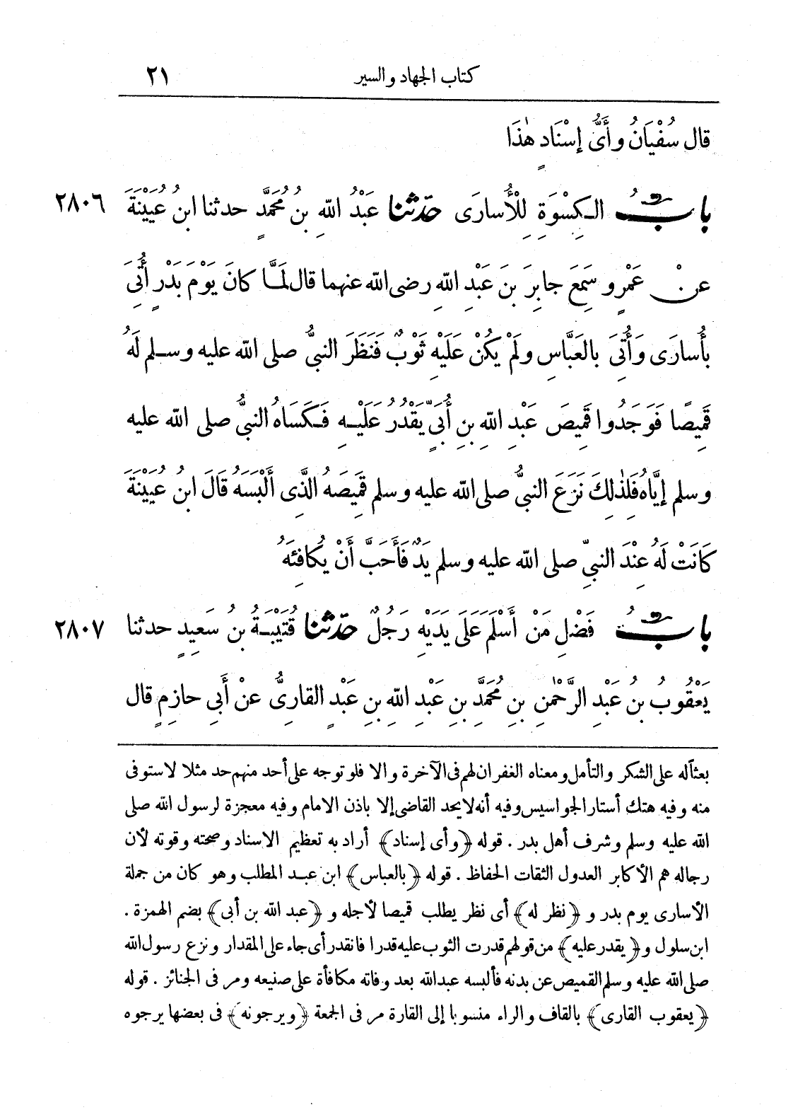 بعثا له على الشكر والتأمل ومعناه الغفران لهم في الآخرة وإلا فلو توجه على أحد منهم حد مثلا لاستوفى منه وفيه هتك أستار الجواسيس وفيه أنه لا يحد القاضي إلا بإذن الإمام وفيه معجزة لرسول الله صلى الله عليه وسلم وشرف أهل بدر. قوله (وأي إسناد) أراد به تعظيم الإسناد وصحته وقوته لأن رجاله هم الأكابر العدول الثقات الحفاظ. قوله (بالعباس) ابن عبد المطلب وهو كان من جملة الأساري يوم بدر و (نظر له) أي نظر يطلب قميصا لأجله و (عبد الله بن أبي) بضم الهمزة. ابن سلول و (يقدر عليه) من قولهم قدرت الثوب عليه قدرا فانقدر رأي جاء على المقدار ونزع رسول الله صلى الله عليه وسلم القميص عن بدنه فألبسه عبد الله بعد وفاته مكافأة على صنيعه ومر في الجنائز، قوله (يعقوب القاري) بالقاف والراء منسوبا إلى القارة مر في الجمعة (ويرجونه) في بعضها يرجوه.