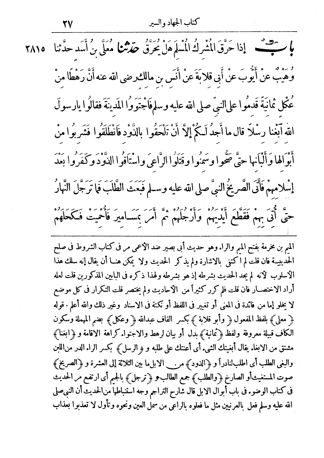 2815 - حَدَّثَنَا مُعَلَّى بْنُ أَسَدٍ حَدَّثَنَا وُهَيْبٌ عَنْ أَيُّوبَ عَنْ أَبِي قِلَابَةَ عَنْ أَنَسِ بْنِ مَالِكٍ رَضِيَ اللَّهُ عَنْهُ أَنَّ رَهْطًا مِنْ عُكْلٍ ثَمَانِيَةً قَدِمُوا عَلَى النَّبِيِّ صَلَّى اللَّهُ عَلَيْهِ وَسَلَّمَ فَاجْتَوَوْا الْمَدِينَةَ فَقَالُوا يَا رَسُولَ اللَّهِ ابْغِنَا رِسْلًا قَالَ مَا أَجِدُ لَكُمْ إِلَّا أَنْ تَلْحَقُوا بِالذَّوْدِ فَانْطَلَقُوا فَشَرِبُوا مِنْ أَبْوَالِهَا وَأَلْبَانِهَا حَتَّى صَحُّوا وَسَمِنُوا وَقَتَلُوا الرَّاعِيَ وَاسْتَاقُوا الذَّوْدَ وَكَفَرُوا بَعْدَ إِسْلَامِهِمْ فَأَتَى الصَّرِيخُ النَّبِيَّ صَلَّى اللَّهُ عَلَيْهِ وَسَلَّمَ فَبَعَثَ الطَّلَبَ فَمَا تَرَجَّلَ النَّهَارُ حَتَّى أُتِيَ بِهِمْ فَقَطَّعَ أَيْدِيَهُمْ وَأَرْجُلَهُمْ ثُمَّ أَمَرَ بِمَسَامِيرَ فَأُحْمِيَتْ فَكَحَلَهُمْ