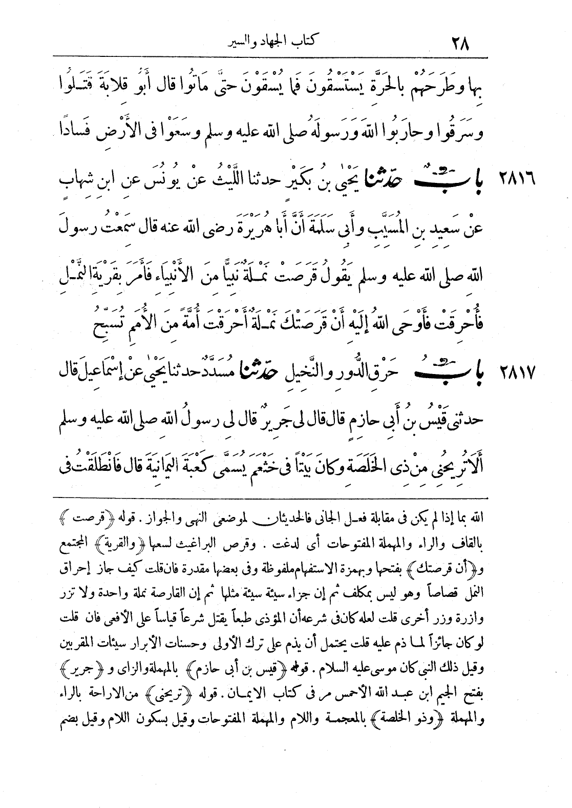 الله بما إذا لم يكن في مقابلة فعل الجاني فالحديثان لموضعي النهي والجواز، قوله (قرصت) بالقاف والراء والمهملة المفتوحات أي لدغت، وقرص البراغيث لسعها (والقرية) المجتمع و (أن قرصتك) بفتحها وبهمزة الاستفهام ملفوظة وفي بعضها مقدرة فإن قلت كيف جاز إحراق النمل قصاصا وهو ليس بمكلف ثم إن جزاء سيئة سيئة مثلها ثم إن القارصة نملة واحدة ولا تزر وازرة وزر أخرى قلت لعله كان في شرعه أن المؤذى طبعا يقتل شرعًا قياسًا على الأفعى فإن قلت لو كان جائزا لما ذم عليه قلت يحتمل أن يذم على ترك الأولى وحسنات الأبرار سيئات المقربين وقيل ذلك النبي كان موسى عليه السلام. قوله (قيس بن أبي حازم) بالمهملة والزاي و (جرير) بفتح الجيم ابن عبد الله الأحمس مر في كتاب الإيمان. قوله (تريحني) من الإراحة بالراء والمهملة (وذو الخلصة) بالمعجمة واللام المهملة المفتوحات وقيل بسكون اللام وقيل بضم