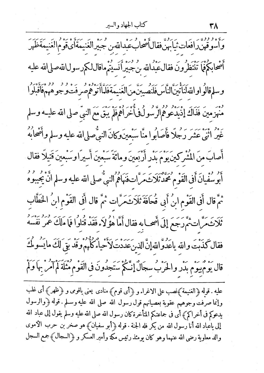 عليه، قوله (الغنيمة) نصب على الإغراء و (أي قوم) منادى يعني يا قومي و (ظهر) أي غلب وإنما صرفت وجوههم عقوبة بعصيانهم قول رسول الله صلى الله عليه وسلم. قوله (والرسول يدعوكم في أخراكم) أي في جماعتكم المتأخرة كان رسول الله صلى الله عليه وسلم يقول إلي عباد الله إلي عباد الله أنا رسول الله من يكر فله الجنة. قوله (أبو سفيان) هو صخر بن حرب الأموي والد معاوية رضي الله عنهما وهو كان يومئذ رئيس مكة وأمير العسكر و (السجال) جمع السجل