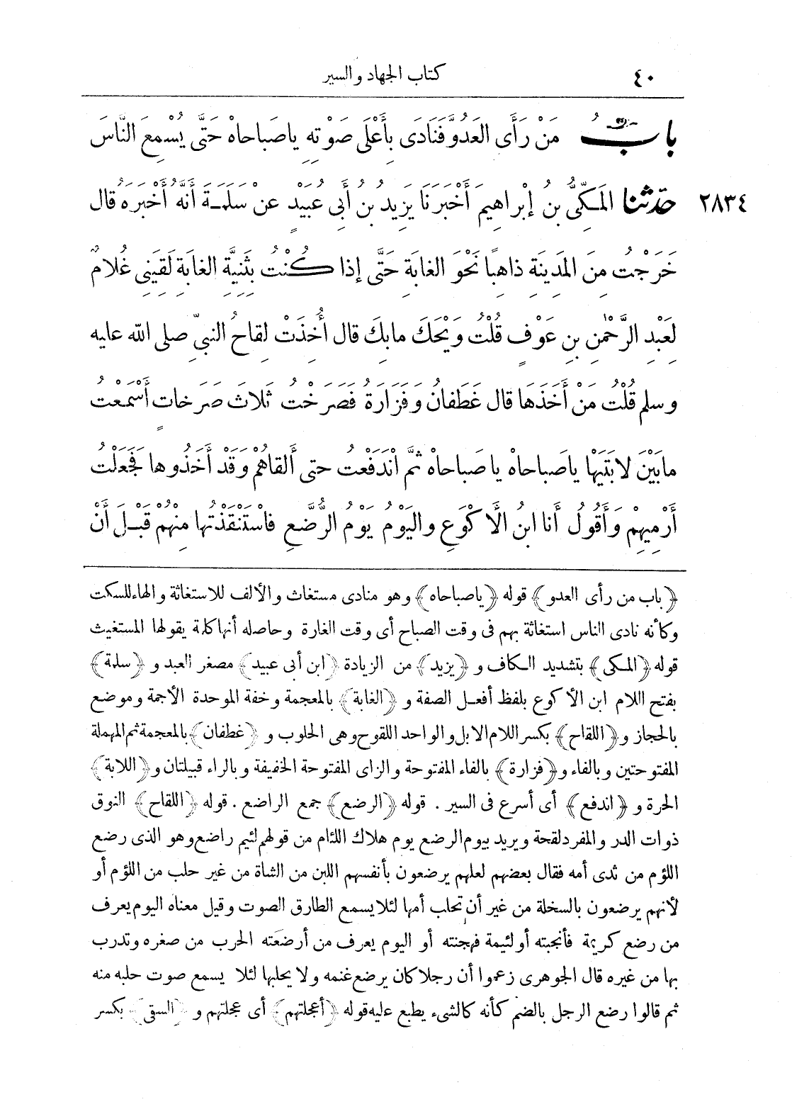 2834 - حَدَّثَنَا الْمَكِّيُّ بْنُ إِبْرَاهِيمَ أَخْبَرَنَا يَزِيدُ بْنُ أَبِي عُبَيْدٍ عَنْ سَلَمَةَ أَنَّهُ أَخْبَرَهُ قَالَ خَرَجْتُ مِنْ الْمَدِينَةِ ذَاهِبًا نَحْوَ الْغَابَةِ حَتَّى إِذَا كُنْتُ بِثَنِيَّةِ الْغَابَةِ لَقِيَنِي غُلَامٌ لِعَبْدِ الرَّحْمَنِ بْنِ عَوْفٍ قُلْتُ وَيْحَكَ مَا بِكَ قَالَ أُخِذَتْ لِقَاحُ النَّبِيِّ صَلَّى اللَّهُ عَلَيْهِ وَسَلَّمَ قُلْتُ مَنْ أَخَذَهَا قَالَ غَطَفَانُ وَفَزَارَةُ فَصَرَخْتُ ثَلَاثَ صَرَخَاتٍ أَسْمَعْتُ مَا بَيْنَ لَابَتَيْهَا يَا صَبَاحَاهْ يَا صَبَاحَاهْ ثُمَّ انْدَفَعْتُ حَتَّى أَلْقَاهُمْ وَقَدْ أَخَذُوهَا فَجَعَلْتُ أَرْمِيهِمْ وَأَقُولُ أَنَا ابْنُ الْأَكْوَعِ وَالْيَوْمُ يَوْمُ الرُّضَّعْ فَاسْتَنْقَذْتُهَا مِنْهُمْ قَبْلَ أَنْ