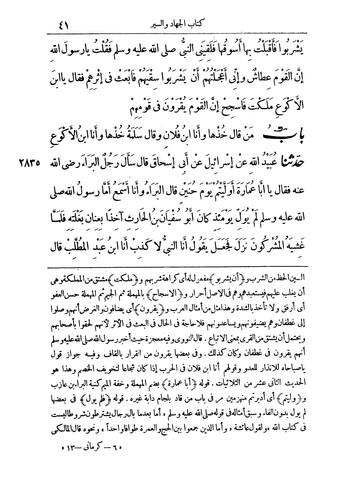 2835 - حَدَّثَنَا عُبَيْدُ اللَّهِ عَنْ إِسْرَائِيلَ عَنْ أَبِي إِسْحَاقَ قَالَ سَأَلَ رَجُلٌ الْبَرَاءَ رَضِيَ اللَّهُ عَنْهُ فَقَالَ يَا أَبَا عُمَارَةَ أَوَلَّيْتُمْ يَوْمَ حُنَيْنٍ قَالَ الْبَرَاءُ وَأَنَا أَسْمَعُ أَمَّا رَسُولُ اللَّهِ صَلَّى اللَّهُ عَلَيْهِ وَسَلَّمَ لَمْ يُوَلِّ يَوْمَئِذٍ كَانَ أَبُو سُفْيَانَ بْنُ الْحَارِثِ آخِذًا بِعِنَانِ بَغْلَتِهِ فَلَمَّا غَشِيَهُ الْمُشْرِكُونَ نَزَلَ فَجَعَلَ يَقُولُ أَنَا النَّبِيُّ لَا كَذِبْ أَنَا ابْنُ عَبْدِ الْمُطَّلِبْ قَالَ