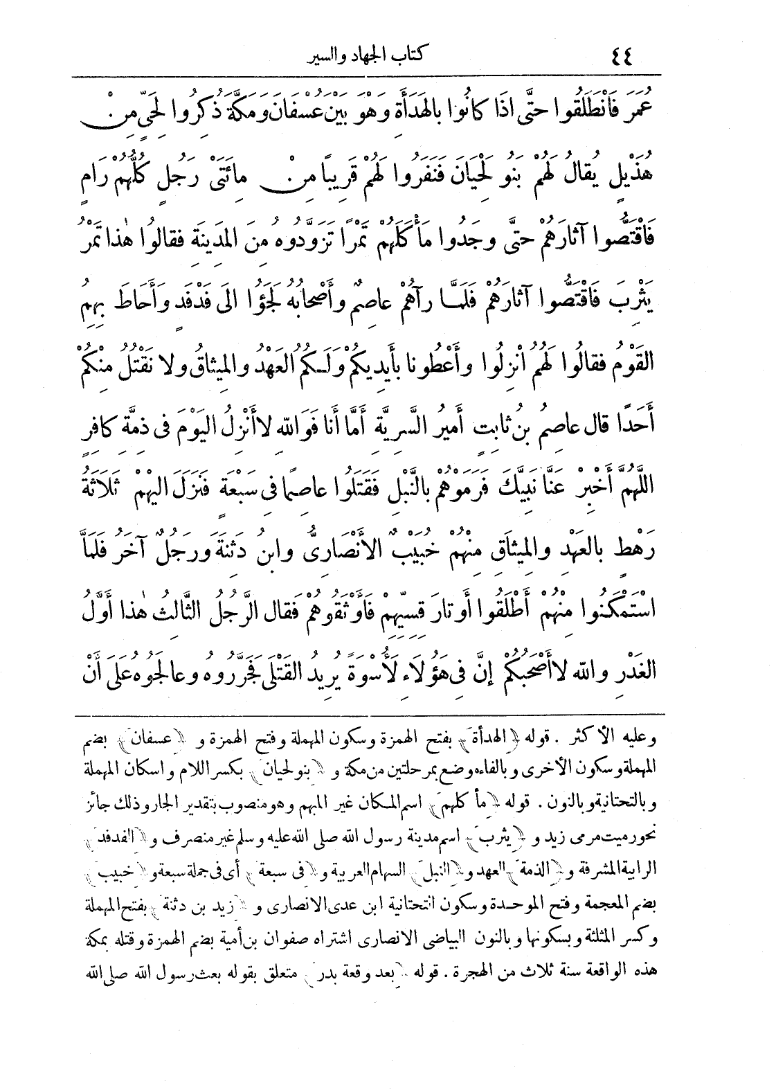 عُمَرَ فَانْطَلَقُوا حَتَّى إِذَا كَانُوا بِالْهَدَأَةِ وَهُوَ بَيْنَ عُسْفَانَ وَمَكَّةَ ذُكِرُوا لِحَيٍّ مِنْ هُذَيْلٍ يُقَالُ لَهُمْ بَنُو لَحْيَانَ فَنَفَرُوا لَهُمْ قَرِيبًا مِنْ مِائَتَيْ رَجُلٍ كُلُّهُمْ رَامٍ فَاقْتَصُّوا آثَارَهُمْ حَتَّى وَجَدُوا مَاكَلَهُمْ تَمْرًا تَزَوَّدُوهُ مِنْ الْمَدِينَةِ فَقَالُوا هَذَا تَمْرُ يَثْرِبَ فَاقْتَصُّوا آثَارَهُمْ فَلَمَّا رَآهُمْ عَاصِمٌ وَأَصْحَابُهُ لَجَئُوا إِلَى فَدْفَدٍ وَأَحَاطَ بِهِمْ الْقَوْمُ فَقَالُوا لَهُمْ انْزِلُوا وَأَعْطُونَا بِأَيْدِيكُمْ وَلَكُمْ الْعَهْدُ وَالْمِيثَاقُ وَلَا نَقْتُلُ مِنْكُمْ أَحَدًا قَالَ عَاصِمُ بْنُ ثَابِتٍ أَمِيرُ السَّرِيَّةِ أَمَّا أَنَا فَوَاللَّهِ لَا أَنْزِلُ الْيَوْمَ فِي ذِمَّةِ كَافِرٍ اللَّهُمَّ أَخْبِرْ عَنَّا نَبِيَّكَ فَرَمَوْهُمْ بِالنَّبْلِ فَقَتَلُوا عَاصِمًا فِي سَبْعَةٍ فَنَزَلَ إِلَيْهِمْ ثَلَاثَةُ رَهْطٍ بِالْعَهْدِ وَالْمِيثَاقِ مِنْهُمْ خُبَيْبٌ الْأَنْصَارِيُّ وَابْنُ دَثِنَةَ وَرَجُلٌ آخَرُ فَلَمَّا اسْتَمْكَنُوا مِنْهُمْ أَطْلَقُوا أَوْتَارَ قِسِيِّهِمْ فَأَوْثَقُوهُمْ فَقَالَ الرَّجُلُ الثَّالِثُ هَذَا أَوَّلُ الْغَدْرِ وَاللَّهِ لَا أَصْحَبُكُمْ إِنَّ لِي فِي هَؤُلَاءِ لَأُسْوَةً يُرِيدُ الْقَتْلَى فَجَرَّرُوهُ وَعَالَجُوهُ عَلَى أَنْ