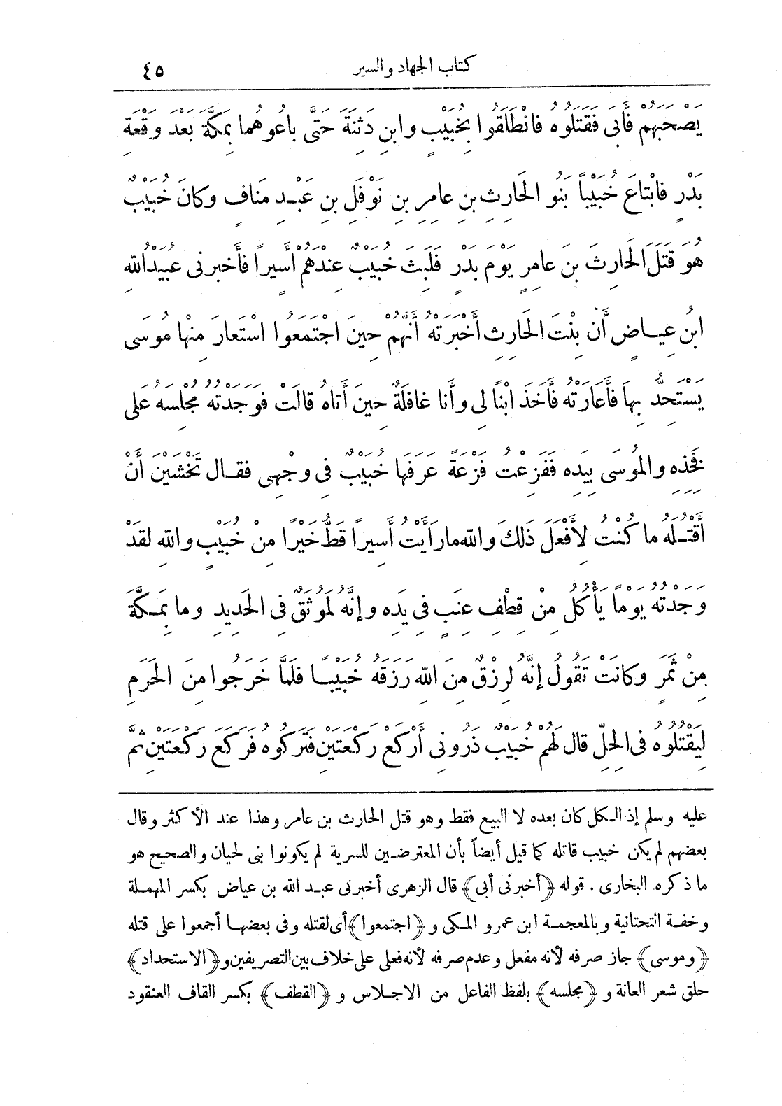 يَصْحَبَهُمْ فَأَبَى فَقَتَلُوهُ فَانْطَلَقُوا بِخُبَيْبٍ وَابْنِ دَثِنَةَ حَتَّى بَاعُوهُمَا بِمَكَّةَ بَعْدَ وَقْعَةِ بَدْرٍ فَابْتَاعَ خُبَيْبًا بَنُو الْحَارِثِ بْنِ عَامِرِ بْنِ نَوْفَلِ بْنِ عَبْدِ مَنَافٍ وَكَانَ خُبَيْبٌ هُوَ قَتَلَ الْحَارِثَ بْنَ عَامِرٍ يَوْمَ بَدْرٍ فَلَبِثَ خُبَيْبٌ عِنْدَهُمْ أَسِيرًا فَأَخْبَرَنِي عُبَيْدُ اللَّهِ بْنُ عِيَاضٍ أَنَّ بِنْتَ الْحَارِثِ أَخْبَرَتْهُ أَنَّهُمْ حِينَ اجْتَمَعُوا اسْتَعَارَ مِنْهَا مُوسَى يَسْتَحِدُّ بِهَا فَأَعَارَتْهُ فَأَخَذَ ابْنًا لِي وَأَنَا غَافِلَةٌ حِينَ أَتَاهُ قَالَتْ فَوَجَدْتُهُ مُجْلِسَهُ عَلَى فَخِذِهِ وَالْمُوسَى بِيَدِهِ فَفَزِعْتُ فَزْعَةً عَرَفَهَا خُبَيْبٌ فِي وَجْهِي فَقَالَ تَخْشَيْنَ أَنْ أَقْتُلَهُ مَا كُنْتُ لِأَفْعَلَ ذَلِكَ وَاللَّهِ مَا رَأَيْتُ أَسِيرًا قَطُّ خَيْرًا مِنْ خُبَيْبٍ وَاللَّهِ لَقَدْ وَجَدْتُهُ يَوْمًا يَاكُلُ مِنْ قِطْفِ عِنَبٍ فِي يَدِهِ وَإِنَّهُ لَمُوثَقٌ فِي الْحَدِيدِ وَمَا بِمَكَّةَ مِنْ ثَمَرٍ وَكَانَتْ تَقُولُ إِنَّهُ لَرِزْقٌ مِنْ اللَّهِ رَزَقَهُ خُبَيْبًا فَلَمَّا خَرَجُوا مِنْ الْحَرَمِ لِيَقْتُلُوهُ فِي الْحِلِّ قَالَ لَهُمْ خُبَيْبٌ ذَرُونِي أَرْكَعْ رَكْعَتَيْنِ فَتَرَكُوهُ فَرَكَعَ رَكْعَتَيْنِ ثُمَّ
