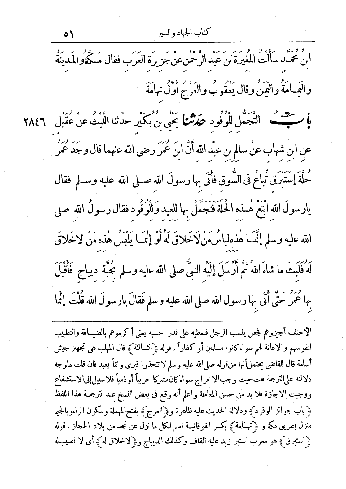 2846 - حَدَّثَنَا يَحْيَى بْنُ بُكَيْرٍ حَدَّثَنَا اللَّيْثُ عَنْ عُقَيْلٍ عَنْ ابْنِ شِهَابٍ عَنْ سَالِمِ بْنِ عَبْدِ اللَّهِ أَنَّ ابْنَ عُمَرَ رَضِيَ اللَّهُ عَنْهُمَا قَالَ وَجَدَ عُمَرُ حُلَّةَ إِسْتَبْرَقٍ تُبَاعُ فِي السُّوقِ فَأَتَى بِهَا رَسُولَ اللَّهِ صَلَّى اللَّهُ عَلَيْهِ وَسَلَّمَ فَقَالَ يَا رَسُولَ اللَّهِ ابْتَعْ هَذِهِ الْحُلَّةَ فَتَجَمَّلْ بِهَا لِلْعِيدِ وَلِلْوُفُودِ فَقَالَ رَسُولُ اللَّهِ صَلَّى اللَّهُ عَلَيْهِ وَسَلَّمَ إِنَّمَا هَذِهِ لِبَاسُ مَنْ لَا خَلَاقَ لَهُ أَوْ إِنَّمَا يَلْبَسُ هَذِهِ مَنْ لَا خَلَاقَ لَهُ فَلَبِثَ مَا شَاءَ اللَّهُ ثُمَّ أَرْسَلَ إِلَيْهِ النَّبِيُّ صَلَّى اللَّهُ عَلَيْهِ وَسَلَّمَ بِجُبَّةِ دِيبَاجٍ فَأَقْبَلَ بِهَا عُمَرُ حَتَّى أَتَى بِهَا رَسُولَ اللَّهِ صَلَّى اللَّهُ عَلَيْهِ وَسَلَّمَ فَقَالَ يَا رَسُولَ اللَّهِ قُلْتَ إِنَّمَا