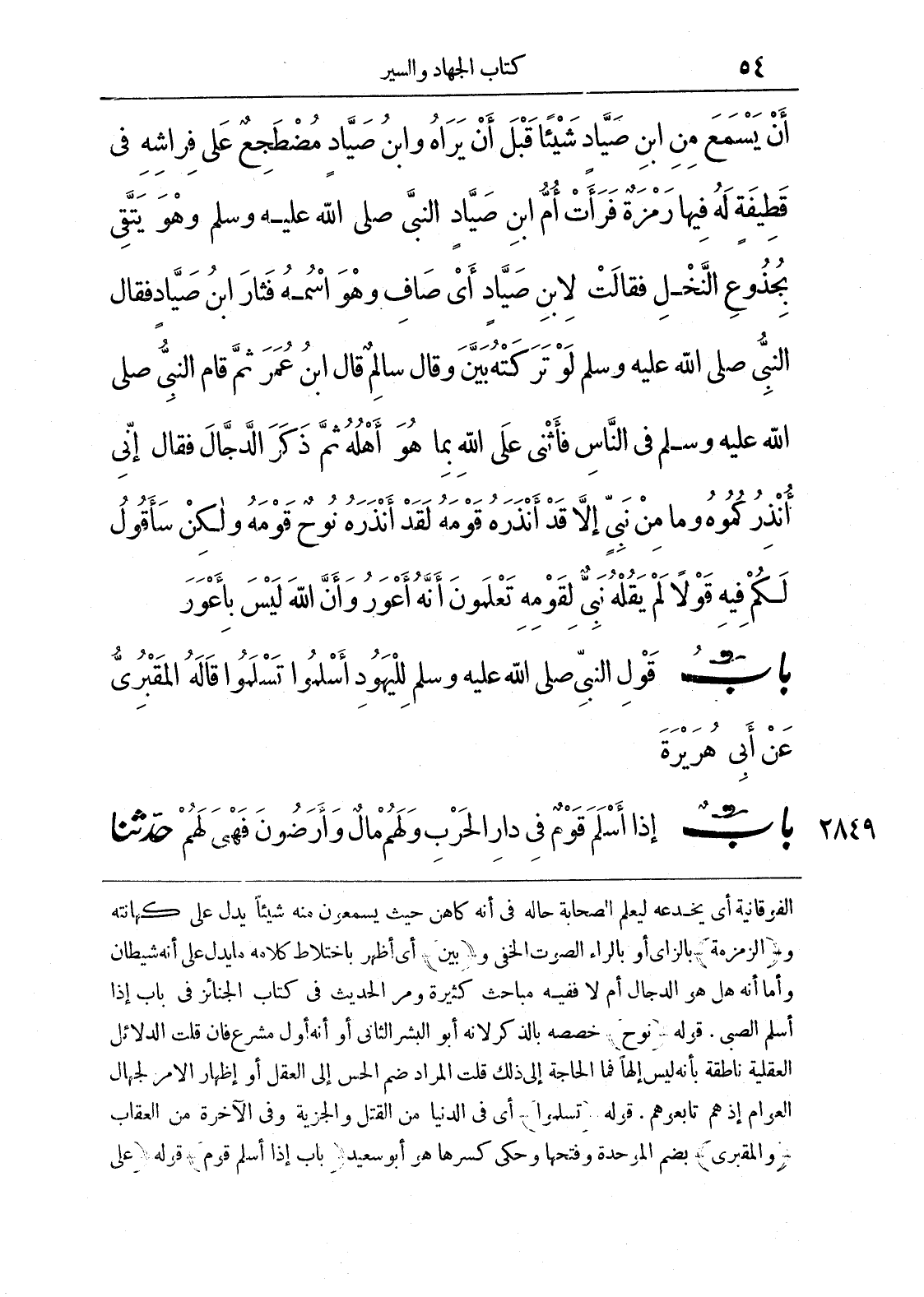 الفوقانية أي يخدعه ليعلم الصحابة حاله في أنه كاهن حيث يسمعون منه شيئًا يدل على كهانته و (الزمزمة) بالزاي أو بالراء الصوت الخفي و (بين) أي أظهر باختلاط كلامه ما يدل على أنه شيطان وأما أنه هل هو الدجال أم لا فقيه مباحث كثيرة ومر الحديث في كتاب الجنائز في باب إذا أسلم الصبي. قوله (نوح) خصصه بالذكر لأنه أبو البشر الثاني أو أنه أول مشرع فإن قلت الدلائل العقلية ناطقة بأنه ليس إلهًا فما الحاجة إلى ذلك قلت المراد ضم الحس إلى العقل أو إظهار الأمر لجهال العوام إذ هم تابعوهم. قوله (تسلموا) أي في الدنيا من القتل والجزية وفي الآخرة من العقاب (والمقبرى) بضم الموحدة وفتحها وحكي كسرها هو أبو سعيد (باب إذا أسلم قوم) قوله (على