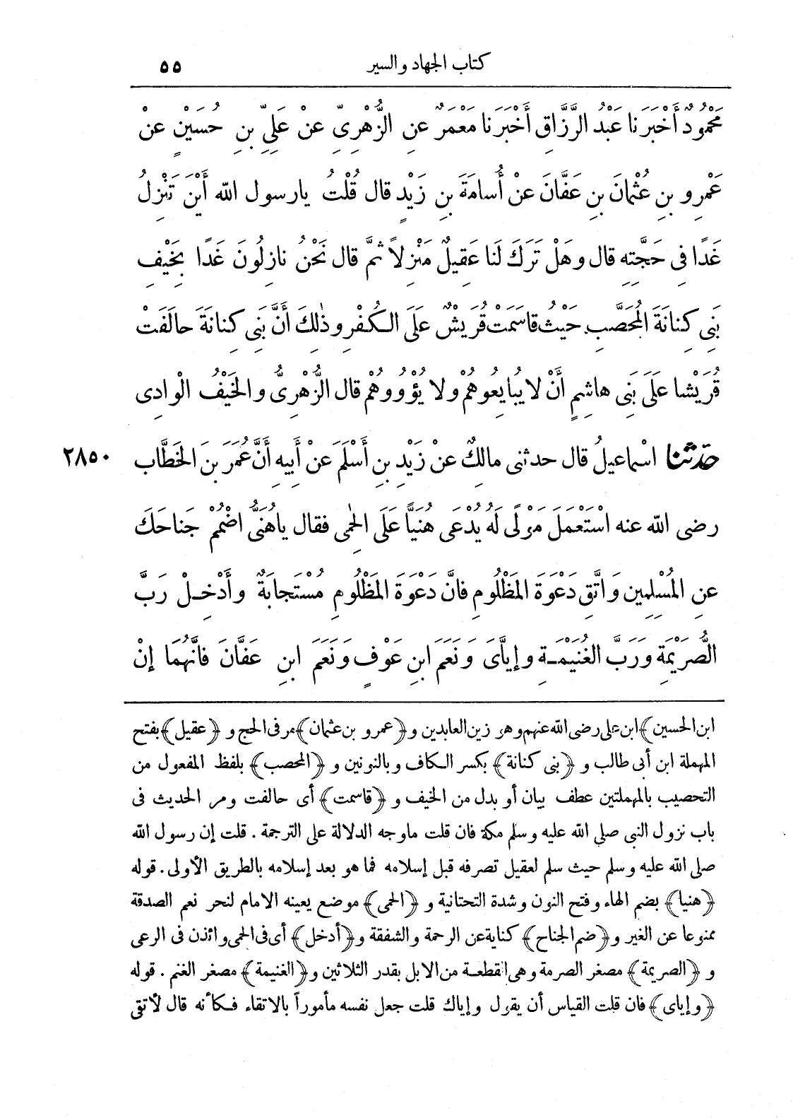 2850 - حَدَّثَنَا إِسْمَاعِيلُ قَالَ حَدَّثَنِي مَالِكٌ عَنْ زَيْدِ بْنِ أَسْلَمَ عَنْ أَبِيهِ أَنَّ عُمَرَ بْنَ الْخَطَّابِ رَضِيَ اللَّهُ عَنْهُ اسْتَعْمَلَ مَوْلًى لَهُ يُدْعَى هُنَيًّا عَلَى الْحِمَى فَقَالَ يَا هُنَيُّ اضْمُمْ جَنَاحَكَ عَنْ الْمُسْلِمِينَ وَاتَّقِ دَعْوَةَ الْمَظْلُومِ فَإِنَّ دَعْوَةَ الْمَظْلُومِ مُسْتَجَابَةٌ وَأَدْخِلْ رَبَّ الصُّرَيْمَةِ وَرَبَّ الْغُنَيْمَةِ وَإِيَّايَ وَنَعَمَ ابْنِ عَوْفٍ وَنَعَمَ ابْنِ عَفَّانَ فَإِنَّهُمَا إِنْ