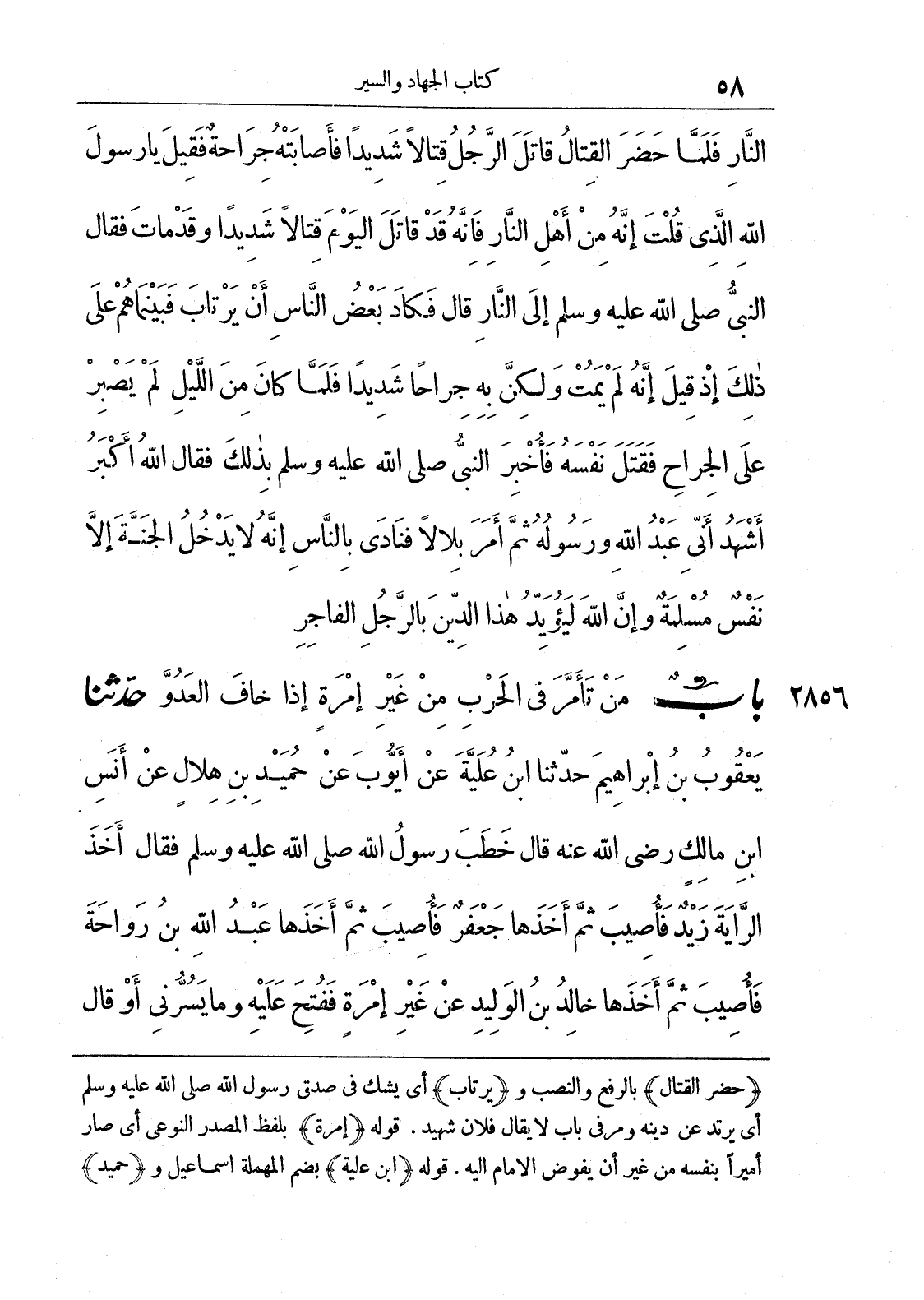2856 - حَدَّثَنَا يَعْقُوبُ بْنُ إِبْرَاهِيمَ حَدَّثَنَا ابْنُ عُلَيَّةَ عَنْ أَيُّوبَ عَنْ حُمَيْدِ بْنِ هِلَالٍ عَنْ أَنَسِ بْنِ مَالِكٍ رَضِيَ اللَّهُ عَنْهُ قَالَ خَطَبَ رَسُولُ اللَّهِ صَلَّى اللَّهُ عَلَيْهِ وَسَلَّمَ فَقَالَ أَخَذَ الرَّايَةَ زَيْدٌ فَأُصِيبَ ثُمَّ أَخَذَهَا جَعْفَرٌ فَأُصِيبَ ثُمَّ أَخَذَهَا عَبْدُ اللَّهِ بْنُ رَوَاحَةَ فَأُصِيبَ ثُمَّ أَخَذَهَا خَالِدُ بْنُ الْوَلِيدِ عَنْ غَيْرِ إِمْرَةٍ فَفُتِحَ عَلَيْهِ وَمَا يَسُرُّنِي أَوْ قَالَ
