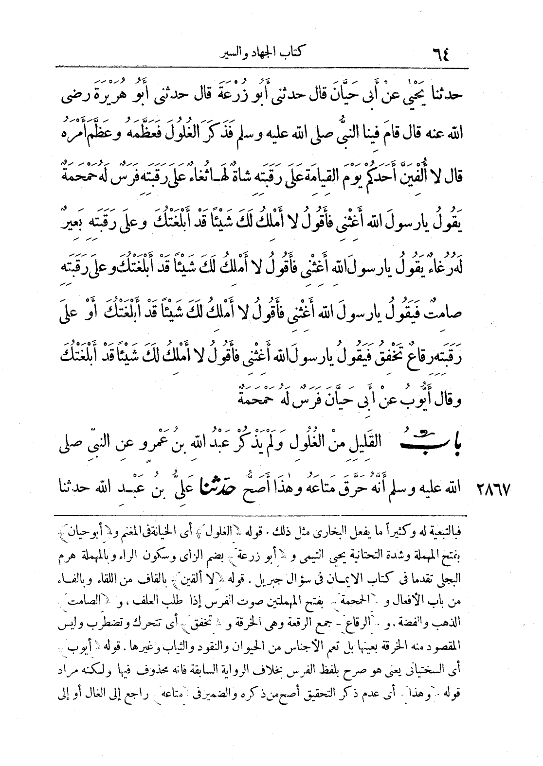 فبالتبعية له وكثيرًا ما يفعل البخاري مثل ذلك. قوله (الغلول) أي الخيانة في المغنم و (أبو حيان) بفتح المهملة وشدة التحتانية يحيى التيمى و (أبو زرعة) بضم الزاي وسكون الراء وبالمهملة هرم البجلى تقدما في كتاب الإيمان في سؤال جبريل. قوله (لا ألقين) بالقاف من اللقاء وبالفاء من باب الأفعال و (الحمحمة) بفتح المهملتين صوت الفرس إذا طلب العلف، و (الصامت) الذهب والفضة، و (الرقاع) جمع الرقعة وهي الخرقة و (تخفق) أي تتحرك وتضطرب وليس المقصود منه الخرقة بعينها بل تعم الأجناس من الحيوان والنقود والثياب وغيرها. قوله (أيوب) أي السختياني يعني هو صرح بلفظ الفرس بخلاف الرواية السابقة فإنه محذوف فيها ولكنه مراد قوله (وهذا) أي عدم ذكر التحقيق أصح من ذكره والضمير في (متاعه) راجع إلى الغال أو إلى