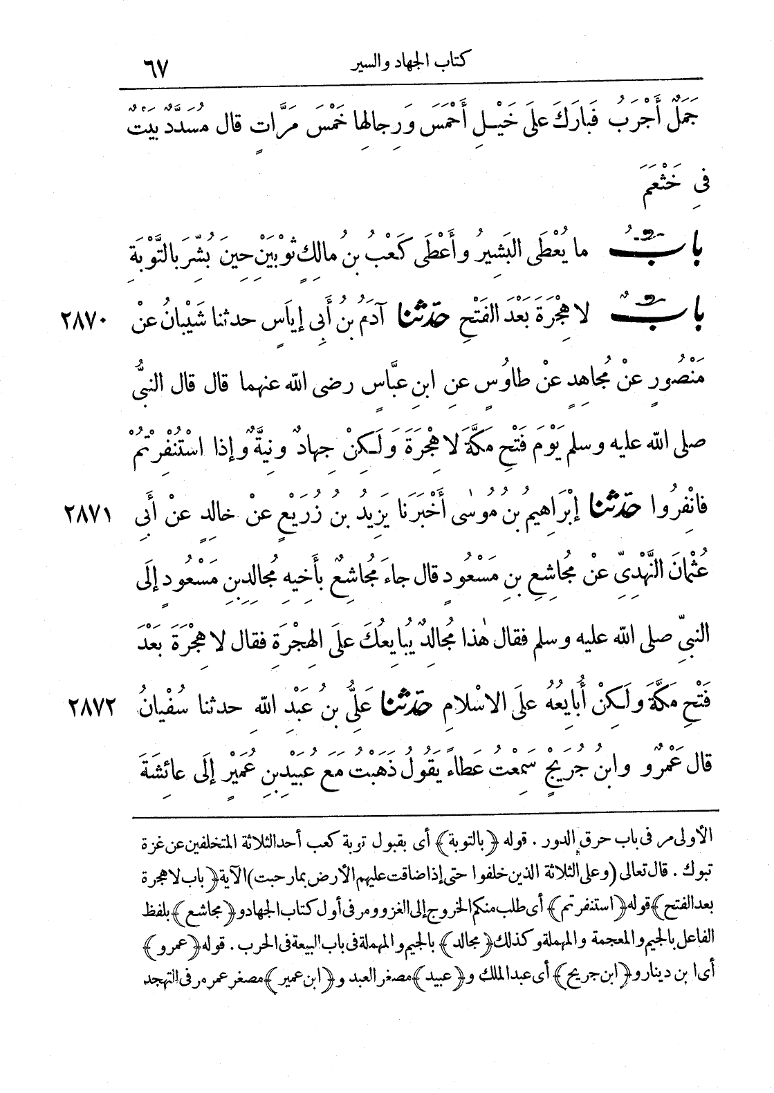 الأولى، مر في باب حرق الدور، قوله (بالتوبة) أي بقبول توبة كعب أحد الثلاثة المتخلفين عن غزوة تبوك. قال تعالى «وعلى الثلاثة الذين خلفوا حتى إذا ضاقت عليهم الأرض بما رحبت» الآية (باب لا هجرة بعد الفتح) قوله (استنفرتم) أي طلب منكم الخروج إلى الغزو، ومر في أول كتاب الجهاد و (مجاشع) بلفظ الفاعل بالجيم والمعجمة والمهملة وكذلك (مجالد) بالجيم والمهملة في باب البيعة في الحرب. قوله (عمرو) أي ابن دينار و (ابن جريح) أي عبد الملك و (عبيد) مصغر العبد و (ابن عمير) مصغر عمر، مر في التهجد