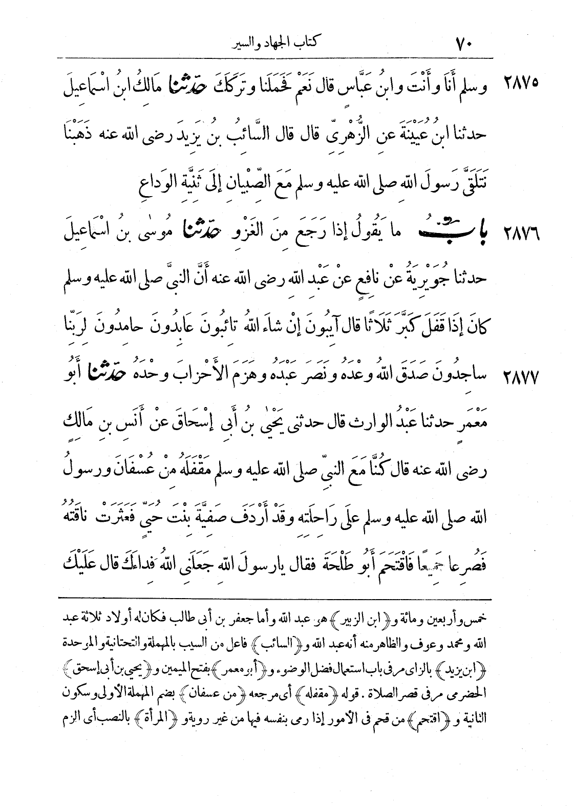2876 - حَدَّثَنَا مُوسَى بْنُ إِسْمَاعِيلَ حَدَّثَنَا جُوَيْرِيَةُ عَنْ نَافِعٍ عَنْ عَبْدِ اللَّهِ رَضِيَ اللَّهُ عَنْهُ أَنَّ النَّبِيَّ صَلَّى اللَّهُ عَلَيْهِ وَسَلَّمَ كَانَ إِذَا قَفَلَ كَبَّرَ ثَلَاثًا قَالَ آيِبُونَ إِنْ شَاءَ اللَّهُ تَائِبُونَ عَابِدُونَ حَامِدُونَ لِرَبِّنَا سَاجِدُونَ صَدَقَ اللَّهُ وَعْدَهُ وَنَصَرَ عَبْدَهُ وَهَزَمَ الْأَحْزَابَ وَحْدَهُ
