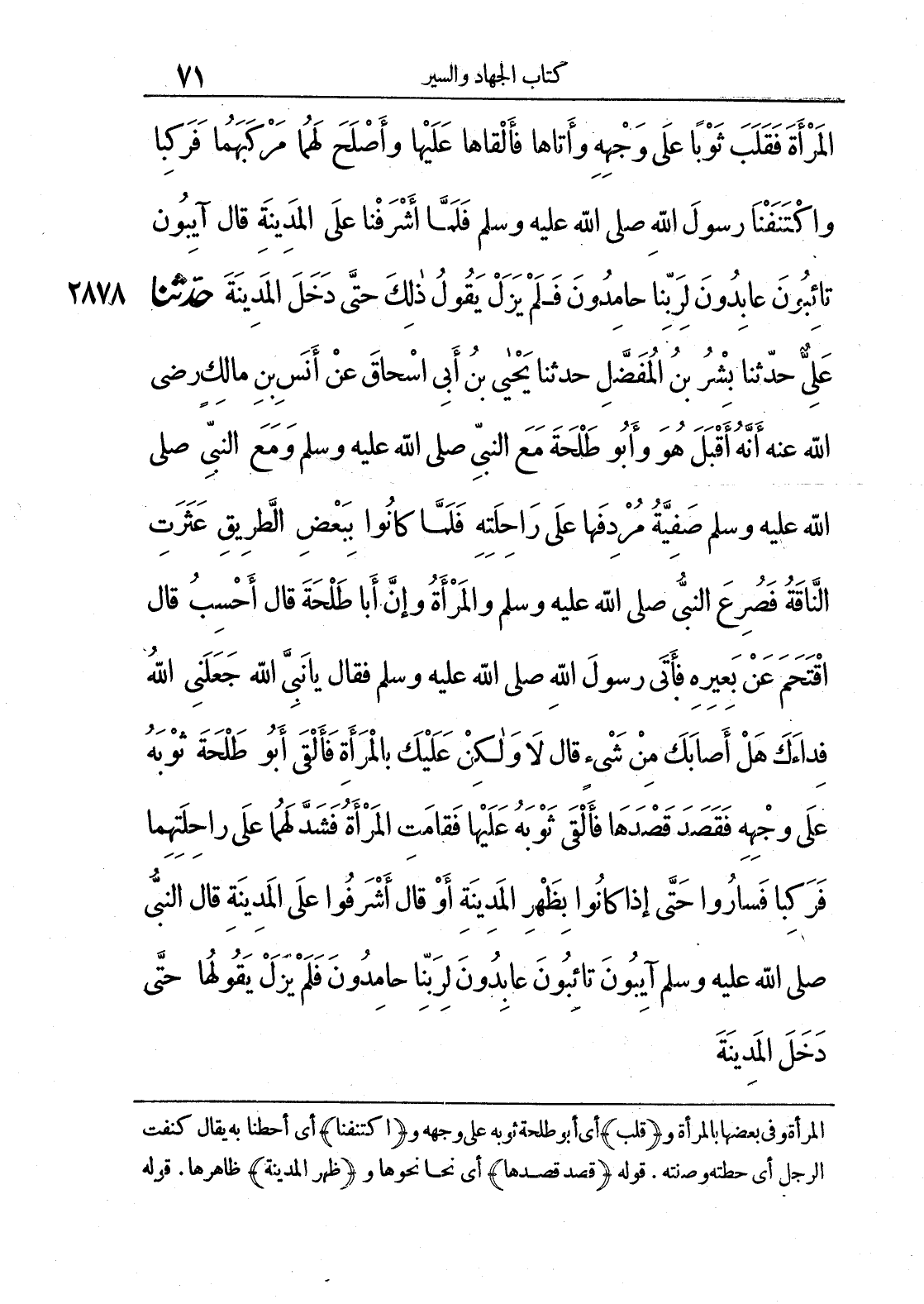 2878 - حَدَّثَنَا عَلِيٌّ حَدَّثَنَا بِشْرُ بْنُ الْمُفَضَّلِ حَدَّثَنَا يَحْيَى بْنُ أَبِي إِسْحَاقَ عَنْ أَنَسِ بْنِ مَالِكٍ رَضِيَ اللَّهُ عَنْهُ أَنَّهُ أَقْبَلَ هُوَ وَأَبُو طَلْحَةَ مَعَ النَّبِيِّ صَلَّى اللَّهُ عَلَيْهِ وَسَلَّمَ وَمَعَ النَّبِيِّ صَلَّى اللَّهُ عَلَيْهِ وَسَلَّمَ صَفِيَّةُ مُرْدِفَهَا عَلَى رَاحِلَتِهِ فَلَمَّا كَانُوا بِبَعْضِ الطَّرِيقِ عَثَرَتْ النَّاقَةُ فَصُرِعَ النَّبِيُّ صَلَّى اللَّهُ عَلَيْهِ وَسَلَّمَ وَالْمَرْأَةُ وَإِنَّ أَبَا طَلْحَةَ قَالَ أَحْسِبُ قَالَ اقْتَحَمَ عَنْ بَعِيرِهِ فَأَتَى رَسُولَ اللَّهِ صَلَّى اللَّهُ عَلَيْهِ وَسَلَّمَ فَقَالَ يَا نَبِيَّ اللَّهِ جَعَلَنِي اللَّهُ فِدَاءَكَ هَلْ أَصَابَكَ مِنْ شَيْءٍ قَالَ لَا وَلَكِنْ عَلَيْكَ بِالْمَرْأَةِ فَأَلْقَى أَبُو طَلْحَةَ ثَوْبَهُ عَلَى وَجْهِهِ فَقَصَدَ قَصْدَهَا فَأَلْقَى ثَوْبَهُ عَلَيْهَا فَقَامَتْ الْمَرْأَةُ فَشَدَّ لَهُمَا عَلَى رَاحِلَتِهِمَا فَرَكِبَا فَسَارُوا حَتَّى إِذَا كَانُوا بِظَهْرِ الْمَدِينَةِ أَوْ قَالَ أَشْرَفُوا عَلَى الْمَدِينَةِ قَالَ النَّبِيُّ صَلَّى اللَّهُ عَلَيْهِ وَسَلَّمَ آيِبُونَ تَائِبُونَ عَابِدُونَ لِرَبِّنَا حَامِدُونَ فَلَمْ يَزَلْ يَقُولُهَا حَتَّى دَخَلَ الْمَدِينَةَ