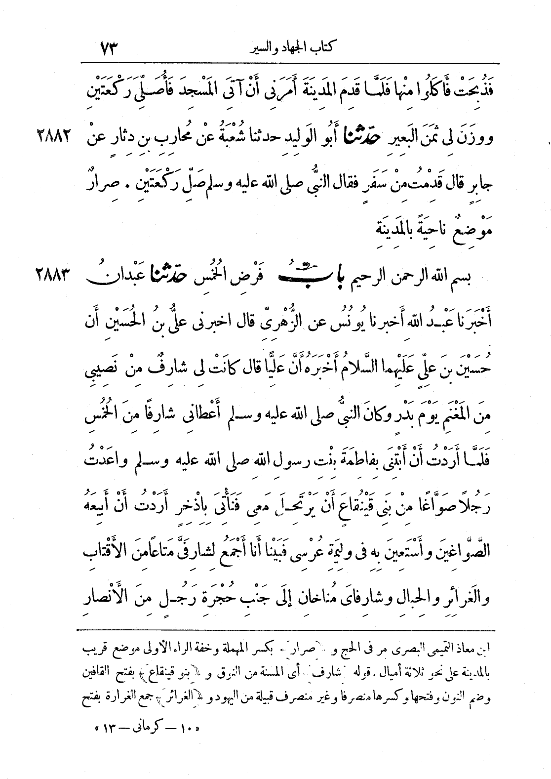 2882 - حَدَّثَنَا أَبُو الْوَلِيدِ حَدَّثَنَا شُعْبَةُ عَنْ مُحَارِبِ بْنِ دِثَارٍ عَنْ جَابِرٍ قَالَ قَدِمْتُ مِنْ سَفَرٍ فَقَالَ النَّبِيُّ صَلَّى اللَّهُ عَلَيْهِ وَسَلَّمَ صَلِّ رَكْعَتَيْنِ صِرَارٌ مَوْضِعٌ نَاحِيَةً بِالْمَدِينَةِ