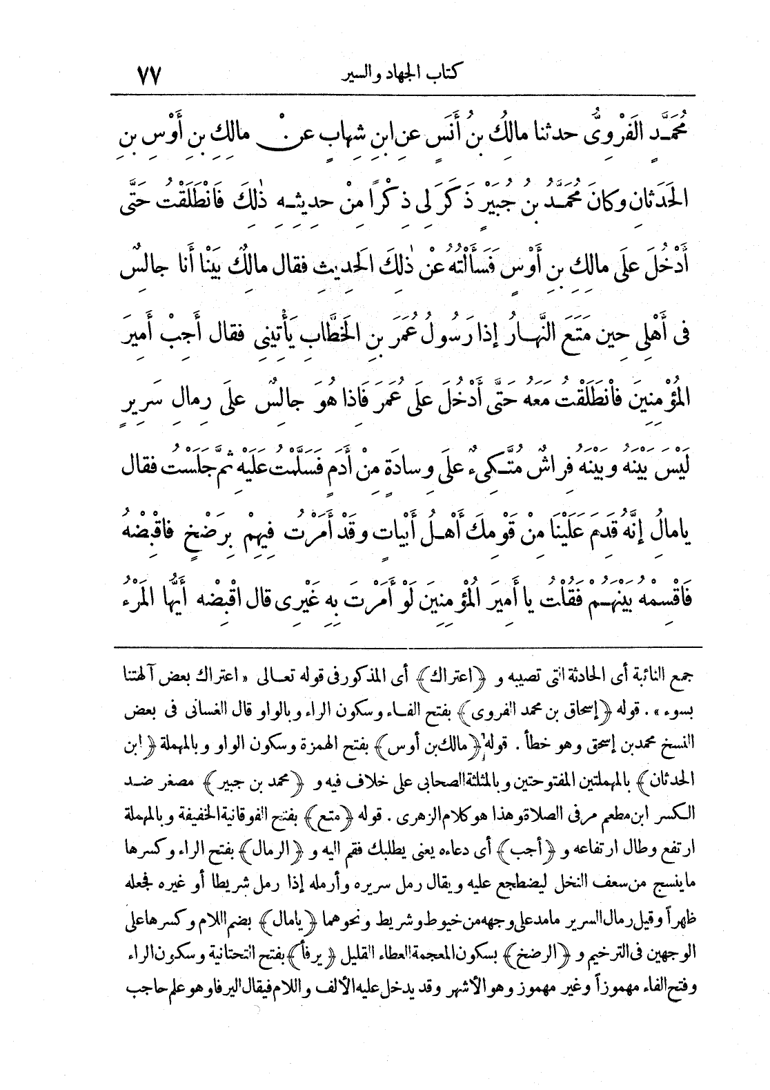 مُحَمَّدٍ الْفَرْوِيُّ حَدَّثَنَا مَالِكُ بْنُ أَنَسٍ عَنْ ابْنِ شِهَابٍ عَنْ مَالِكِ بْنِ أَوْسِ بْنِ الْحَدَثَانِ وَكَانَ مُحَمَّدُ بْنُ جُبَيْرٍ ذَكَرَ لِي ذِكْرًا مِنْ حَدِيثِهِ ذَلِكَ فَانْطَلَقْتُ حَتَّى أَدْخُلَ عَلَى مَالِكِ بْنِ أَوْسٍ فَسَأَلْتُهُ عَنْ ذَلِكَ الْحَدِيثِ فَقَالَ مَالِكٌ بَيْنَا أَنَا جَالِسٌ فِي أَهْلِي حِينَ مَتَعَ النَّهَارُ إِذَا رَسُولُ عُمَرَ بْنِ الْخَطَّابِ يَاتِينِي فَقَالَ أَجِبْ أَمِيرَ الْمُؤْمِنِينَ فَانْطَلَقْتُ مَعَهُ حَتَّى أَدْخُلَ عَلَى عُمَرَ فَإِذَا هُوَ جَالِسٌ عَلَى رِمَالِ سَرِيرٍ لَيْسَ بَيْنَهُ وَبَيْنَهُ فِرَاشٌ مُتَّكِئٌ عَلَى وِسَادَةٍ مِنْ أَدَمٍ فَسَلَّمْتُ عَلَيْهِ ثُمَّ جَلَسْتُ فَقَالَ يَا مَالِ إِنَّهُ قَدِمَ عَلَيْنَا مِنْ قَوْمِكَ أَهْلُ أَبْيَاتٍ وَقَدْ أَمَرْتُ فِيهِمْ بِرَضْخٍ فَاقْبِضْهُ فَاقْسِمْهُ بَيْنَهُمْ فَقُلْتُ يَا أَمِيرَ الْمُؤْمِنِينَ لَوْ أَمَرْتَ بِهِ غَيْرِي قَالَ اقْبِضْهُ أَيُّهَا الْمَرْءُ